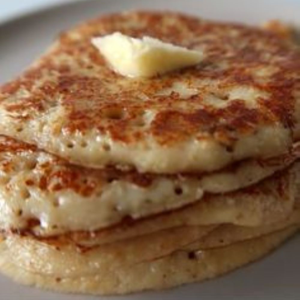 Method: In a large mixing bowl melt the butter (in the microwave) Next, add in the eggs and beat well! Then, add in the sugar and milk, and mix well until completely combined. Add in the vanilla and seasoning, (add fruit or chocolate chips if using). Add the dry ingredients next, flour and baking powder, mix well, dough will be thick!! Add a bit more milk if they are too thick, and a bit more flour if they are too liquid. It should be a good medium consistency. Next, heat a non stick frying pan or griddle to med high heat, if using a frying pan, some melted butter adds a nice crispness to the pancakes! Lightly spray with cooking spray or oil if needed! (Not necessary if using the butter) check the heat of the griddle or pan by splashing a few drops of water on it… it the water dances on contact, its ready. Using a measuring cup, pour rounds of pancake batter on preheated pan, allowing it to spread a bit. when the edges look dry, and bubbles are forming in the center, lift the edge with a flipper to check the under side… should be a nice golden color… proceed to flip and cook the other side till golden as well usually just a few minutes. Remove to a plate while you finish cooking the rest of the pancakes, serve warm with butter, and syrup, and jam!