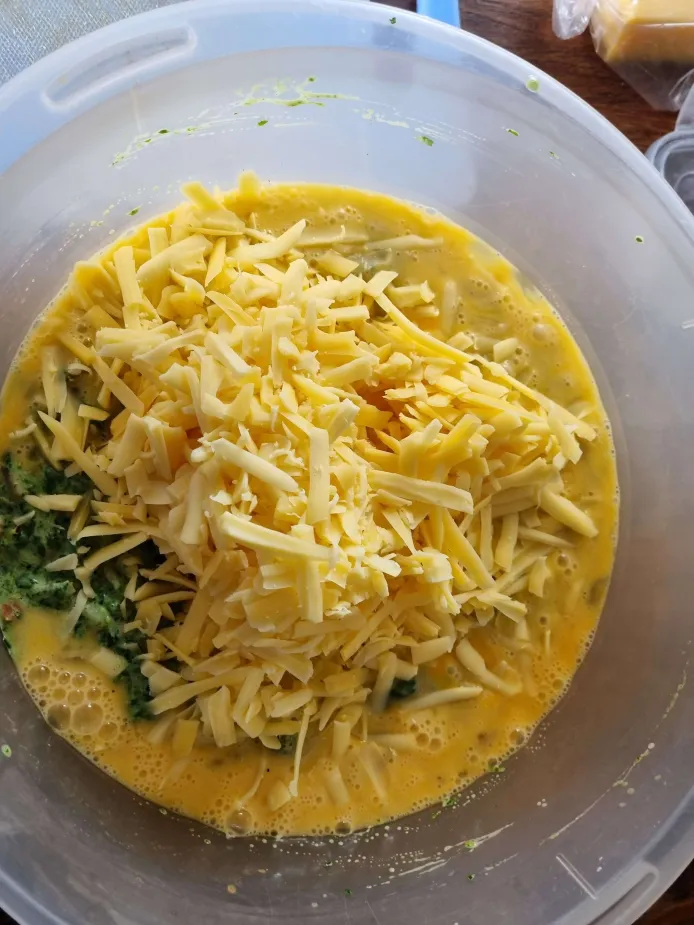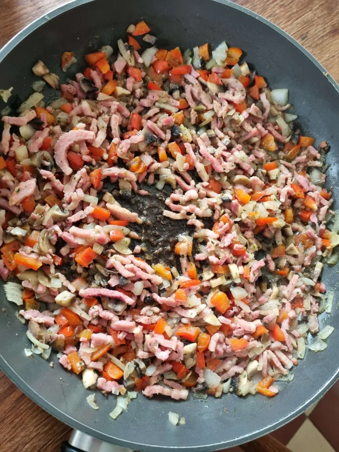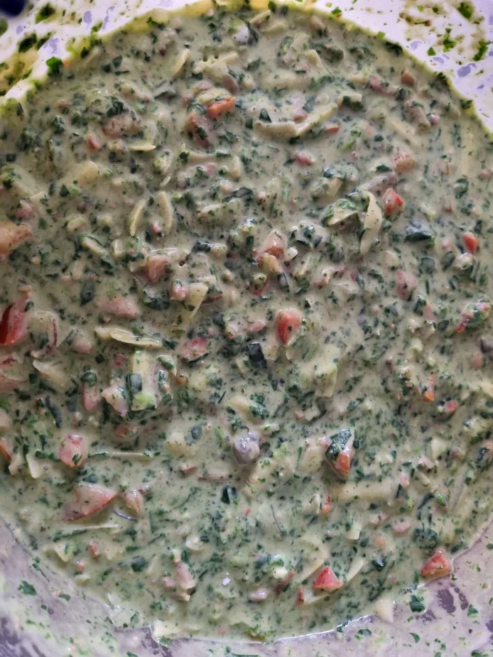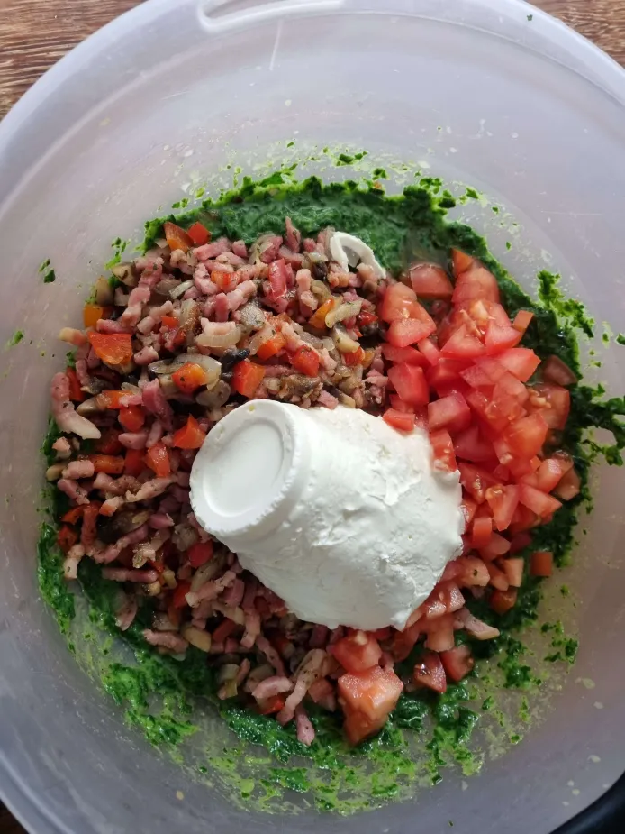 Method: Preheat oven to 190c (400f). First, if not using prepared pie shells, precook the pie shells, according to package directions, and set aside. Next, in a large mixing bowl, microwave the spinach to thaw it for about 4 minutes, we will add hot stuff to this later so it’s fine if its not thawed completely, set aside. Next, in a medium to large frying pan, add a bit of butter or oil, and place over medium high heat, add the mince garlic and cook for a few minutes to release the fragrance, and add the veggies. cook the veggies for 2-3 minutes, and add the bacon to the pan. Continue cooking until the bacon is done, and set aside. Then, we will add the sour cream, milk, eggs, and flour to the spinach, and mix thoroughly. next add the cheese and mix again, it should be getting thick-ish now. Last, but not least, using a spatula, transfer the bacon and veggie mixture from the frying pan to the spinach mixture, and mix completely! Make sure to scrape every last bit into the bowl, we want all those delicious flavors! The next part you will have to eyeball the best you can, carefully pour about half the mixture into each pie shell. From experience, I fill each about half way, and go back and forth, until they are both about even. Again, use your spatula to scrape all the goodness from the bowl, into the pie shells, we don’t like to waste food here!! If your oven is big enough you can cook both at once, rotating half way through. Otherwise, bake one at a time for 35-40 minutes, or until a toothpick inserted in the center comes out clean. We have ours served with some salsa and sour cream! Pro tip: this is excellent cold the next day as well!!