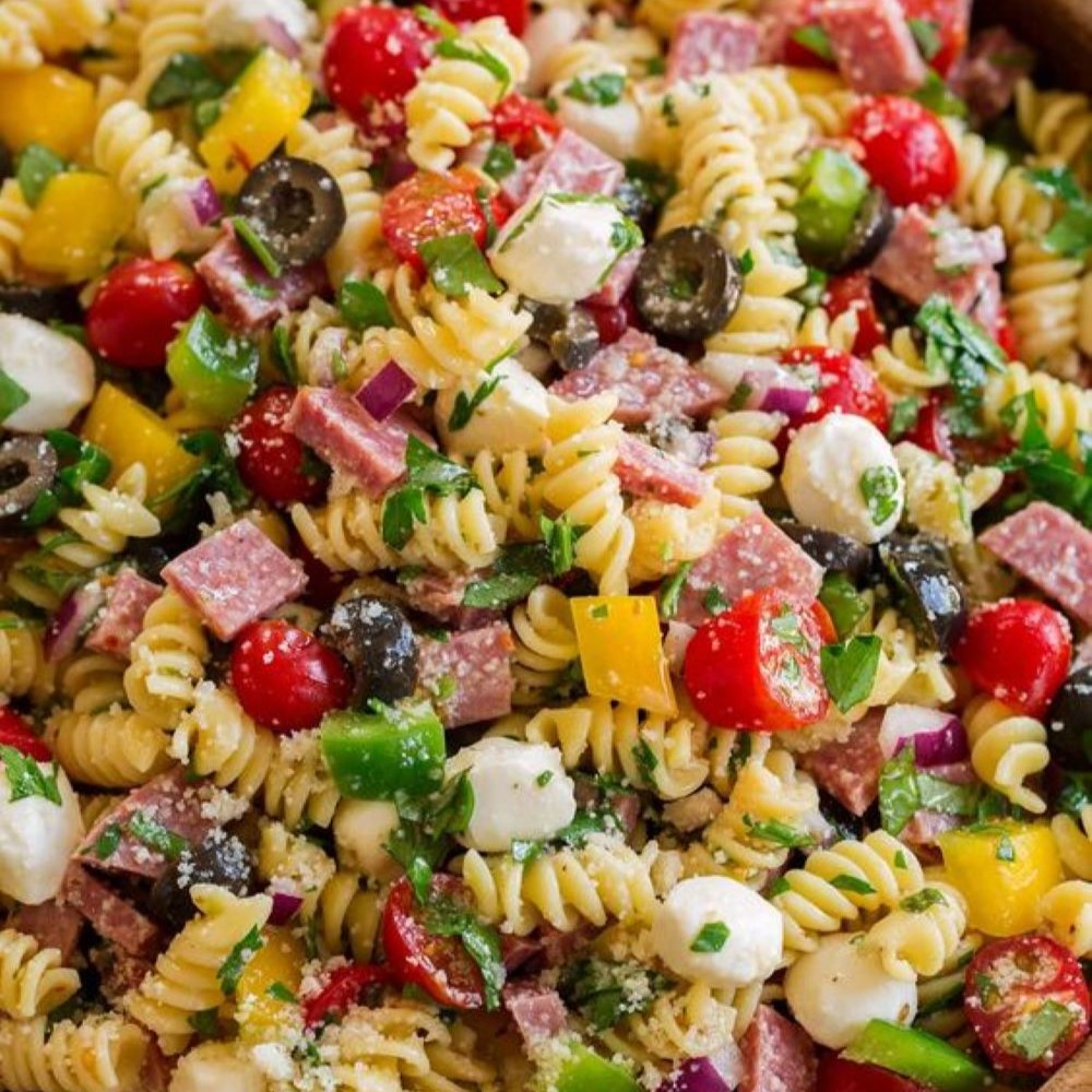 Method: Cook the pasta according to package directions, rinse well in cold water to cool to room temperature and set aside for now. In a large mixing bowl, gather the rest of your ingredients. Add in the veggies and meat first, Then mix in the pasta and stir until combined. Next add in the olives, and cheeses, followed by the seasonings, and dressing. Mix very well to coat everything, and make sure its evenly distributed. Chill for 2-4 hours before serving for the best results, so all the flavors can meld and blend together. Enjoy cold and fresh, with your favorite meal. It’s even better the next day!
