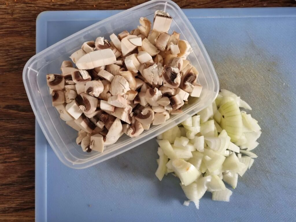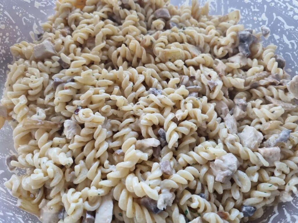 Method: In a medium to large pot, cook the pasta according to package directions. While the pasta is cooking, you can make the rest. I usually cut the veggies first to save time! In a medium frying pan, add a little olive oil or butter and heat to a sizzle. Add the garlic and brown it slightly, releasing the fragrance. Next, add the mushrooms, and onions, cooking for 5-6 minutes, until the veggies at at your desired tenderness. I usually add a splash of soy sauce for color but this is optional. I prefer my veggies a little softer, but you can cook them however you please. While your veggies are cooking, use a spatula to add the sour cream, and cream cheese to a large mixing bowl, and mix well. Add the garlic powder, and parsley, this is your sauce!! Scrape the containers well to get all the yummy goodness out! Next, do the same to the veggies in the pan, use the same spatula and get all the goodies from the pan into the bowl with the spinach mixture. Stir it up super well!! Next, add the precooked chicken, and mix it up to coat the chicken with the sauce. Last but not least, the pasta! Add that in and stir to mix everything up with all the creamy, garlicy, chickeny, deliciousness. I usually serve mine with some grated cheese and a loaf of garlic bread! Enjoy!