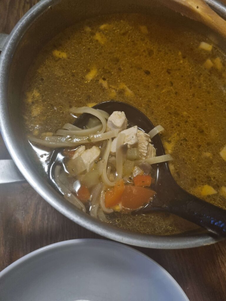Method: In a large pot, add a bit of butter or olive oil and heat on medium high to coat the bottom of the pan. Add the minced garlic, and cook for one minute. Add in the carrots, and celery next, stirring well in the butter/oil. Cook for 4 to 5 minutes, stirring frequently to prevent it from burning. Next, add a bit more butter, or oil if needed, and add the rest of the veggies. Let them cook for 4 to 5 minutes, stirring frequently, until the onions start to become soft. Add in the water next, and the 3 bullion cubes, broken up. 1, it’s going to steam like crazy when you add the first bit of water, this is fine, it will settle down. 2, add only 2 liters/2 cubes if you like a thicker soup. If using chicken stock, no need for the bullion cubes. Next, add in all of the seasonings, a few dashes of soy sauce, and salt and pepper to taste. Bring it to a rolling boil, and reduce heat to medium low. Cover and simmer for 20 minutes or until the carrots are desired tenderness. Add in the noodles, and cook for an additional 5 minutes. Turn off the heat, and let it sit on the burner, covered, for about 10 minutes. Check to make sure the noodles are fully cooked. Enjoy your wonderful, homemade chicken soup!