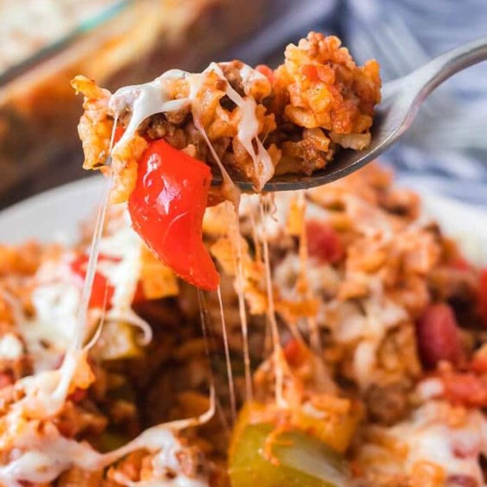 Method: I usually cut the veggies first to save time! In a large frying pan, over medium high heat, add a little olive oil or butter, and heat to a sizzle. Add the garlic and brown it slightly, releasing the fragrance. Next, add the peppers, mushrooms, and onions, (other veggies) cooking for 2-3 minutes, add the meat, and brown completely. Next, you will add in the seasonings, diced tomatoes, and the sauce, stirring well to incorporate. Once it starts bubbling, reduce to low and let simmer for 15 minutes. Preheat over to 200c. Get a baking pan or dish, grease the bottom lightly, and prepare to make the casserole! Remove the sauce from the heat. In a large mixing bowl, combine the rice and meat sauce, should be fairly thick, and a bit saucy. Dump the entire bowl into the prepared baking dish, and level off with a spatula. Sprinkle the cheese over the top. Next, place the casserole in the over for 20-25 minutes, or until the cheesy layer on top has browned a bit, and is nice and bubbly! I usually serve mine with a loaf or two of garlic bread! Enjoy!