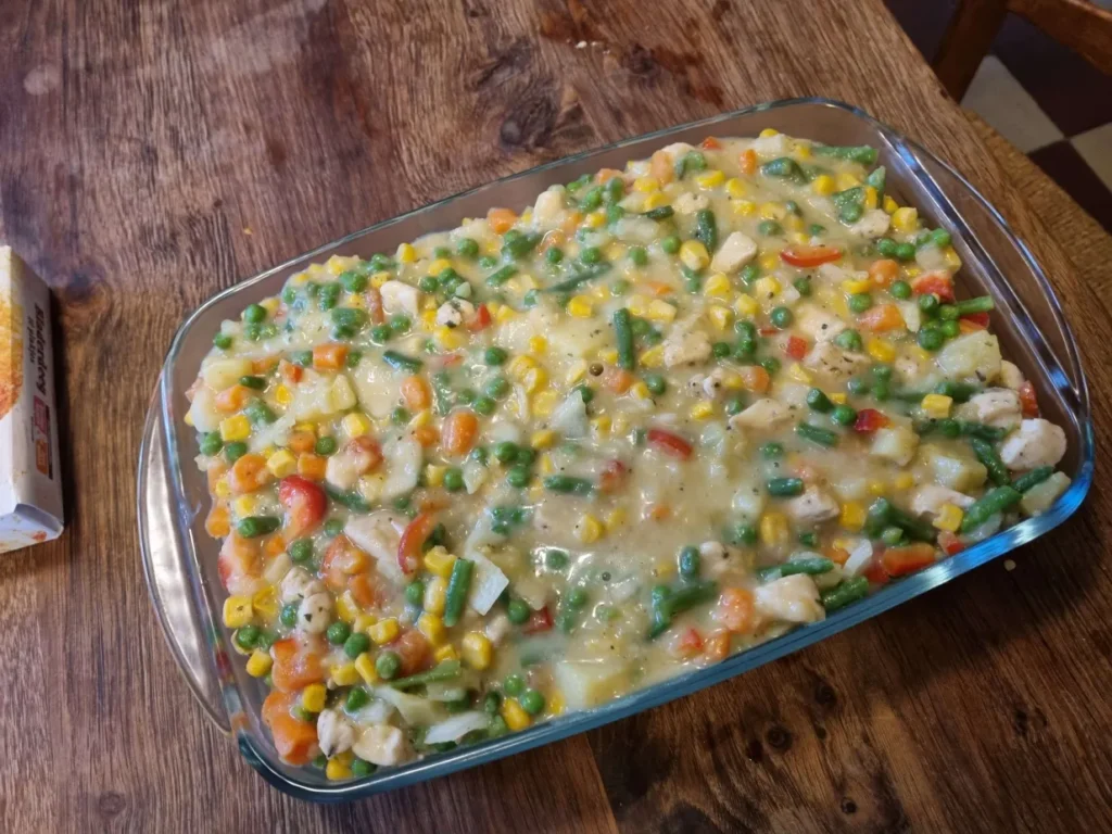 If you prefer to use canned, or fresh veggies, approx. 2 to 3 cups of a mix of green beans, corn, carrots, peas, mushrooms, celery, peppers, leek, or zucchini works wonderfully, just precook the veggies before adding!)