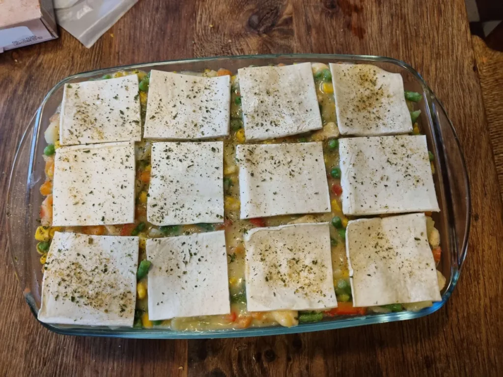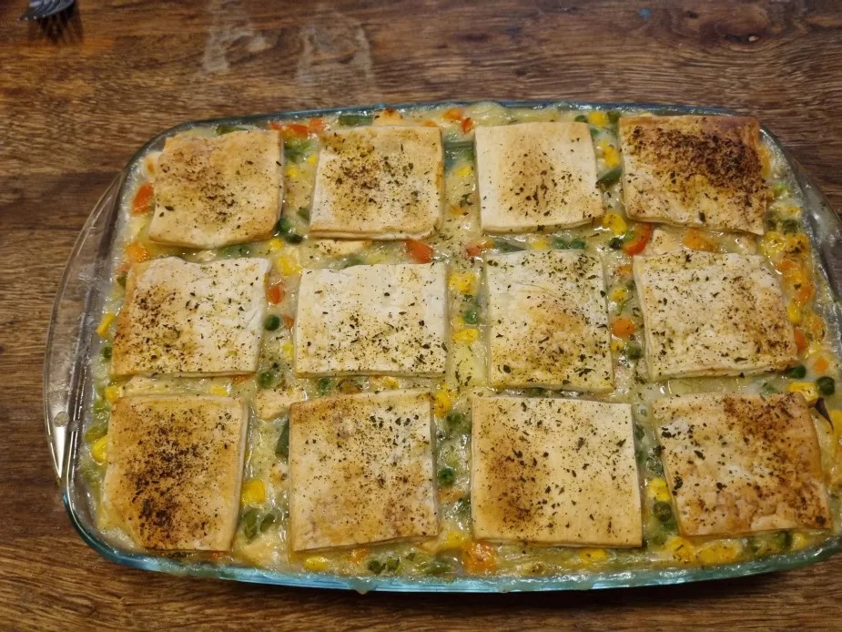 To prepare chicken breast, (if not using, precooked, or leftovers): Season chicken breasts with basil, salt, and black pepper. Place in a baking dish with a drizzle of olive oil and bake at 180°c for about 25-30 minutes. Allow to cool. Chop when cool enough to handle. Set aside. Prepare pie crust using this recipe. Double the recipe. Then cover and refrigerate while preparing the filling. Preheat oven to 375°F. Butter a 9″x13″ baking dish and set aside. Boil potatoes in lightly salted water, for approximately 25 minutes, until they are fork tender, drain and set aside. Melt butter in a large pot, over medium heat. Add onions, and saute, until they are translucent, about 3 minutes. Add flour, and stir to combine. Continue cooking about 2 more minutes, to reheat the mixture. Add flour, and stir to combine. Continue cooking about 2 more minutes to reheat the mixture. Slowly add in chicken broth, about ¼ cup at a time, constantly stirring. Slowly adding it will ensure there are no lumps. Add milk and stir. Continue cooking on medium heat, uncovered until sauce thickens. You should be stirring frequently, to make sure it doesn’t burn at the bottom. When sauce is thickened to the consistency of a medium-thick gravy, add chicken, mixed vegetables, potatoes, and all the seasonings. Stir. Then remove from heat and set aside. If using fresh pie crust, roll out half the pie crust on a lightly floured surface, and lay it in a greased 9″x13″ baking dish. Otherwise, fit the store bought pie dough into the pan. Alternatively, you can make 2, 9in round pies with this recipe as well. Pour in chicken pot pie mixture. Roll out the other half of the pie crust and lay it on top. Press the top and bottom pie crust together (I use a fork for this part). Cut slits in the top to let heat and steam escape. With a pastry brush, brush beaten egg over top of pot pie. Bake in a 375°F oven for 30 minutes. Then cover and return to oven to cook for an additional 30-35 minutes, or until both crusts are golden and cooked through. Remove from oven and allow to sit to firm for about 15-30 minutes before serving.