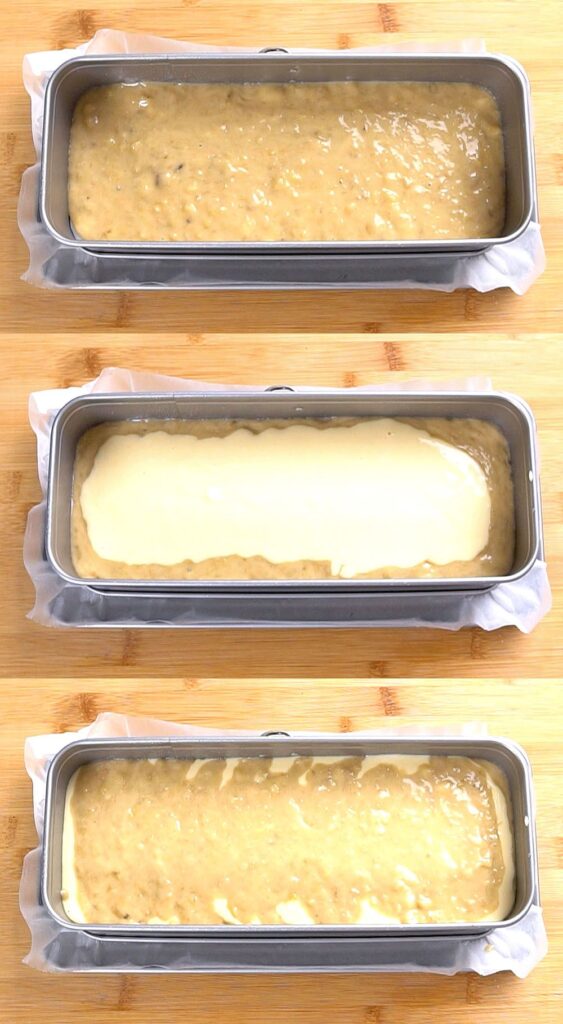 Pour half the banana batter into a prepared loaf pan and spread with a spatula.