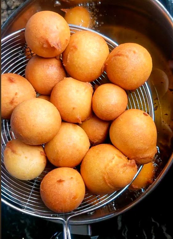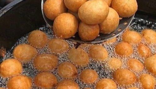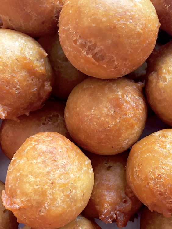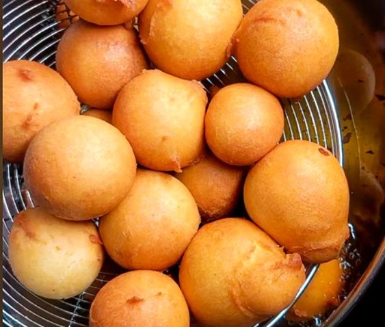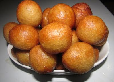 Add flour, salt, sugar, nutmeg, cinnamon, yeast, dry pepper, and flour in a bowl, mix together. This is the type of yeast that you can add directly to your flour, without proofing in warm water. Add your egg, and mix it in the flour, while gradually adding warm water. Place the mixture in a warm place i.e your warm oven or warm microwave. Keep it there to rise for about and 1 hour 30 minutes. It will double in size. If it doesn’t, it means something is wrong with your yeast. Pour the vegetable or canola oil in a deep pan, and place on medium heat. Add the finely diced onion now, if using. It gives a nice flavor, but it is optional. Splash a few drops of water in to test how hot the oil is. Now scoop the mixture with your fingers, or a decent sized spoon, if preferred, and transfer to the pan of oil. Getting perfect round puff puffs is an art… I’m not quite there yet. Fry batch by batch so that you don’t overcrowd the pan. Flip it when it starts to get brown, until it is a nice golden brown. Transfer from the pan to plate lined with paper towels to drain the oil! Enjoy them while they are nice and warm!