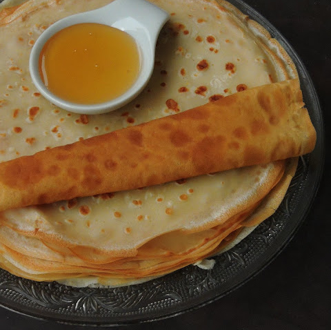 Whisk or blend the eggs, sugar, milk, salt and cardamom powder until frothy. Add the flour slowly and mix until you get a smooth batter. Place a non-stick frying pan on medium heat. Pour about quarter a cup of the batter at the centre of the pan. Use a spoon to quickly spread the batter around the pan in a circular motion. Drizzle a little bit of oil, or melted butter, on top of the pancake, and once the bottom is golden brown flip and cook on the other side. Remove from the pan and place on a plate, cover with a dish towel to keep it soft and moist. Keep cooking the rest of the batter until finished. Enjoy with a drizzle of honey or your favorite toppings!