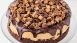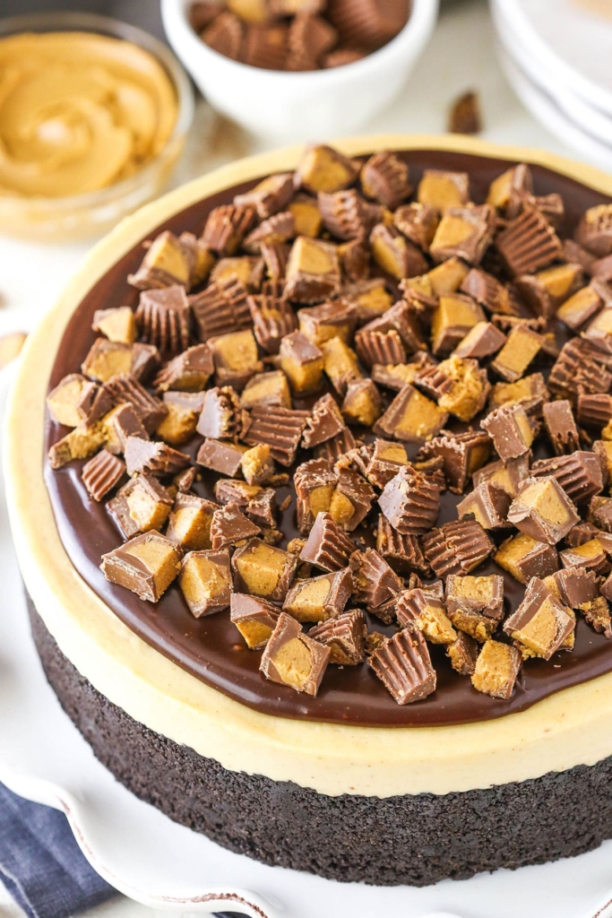 Gently stir in the chopped Reese’s. Set mixture aside. Add the heavy whipping cream and powdered sugar to another mixing bowl and whip on high speed with the whisk attachment until stiff peaks form. Gently fold about half of the whipped cream into the cream cheese mixture until mostly combined, then add the remainder of the whipped cream. Gently fold together until completely combined. Add the filling to the crust and spread into an even layer. Refrigerate cheesecake until firm, 5-6 hours or overnight, the remove from the springform pan and place on serving plate.