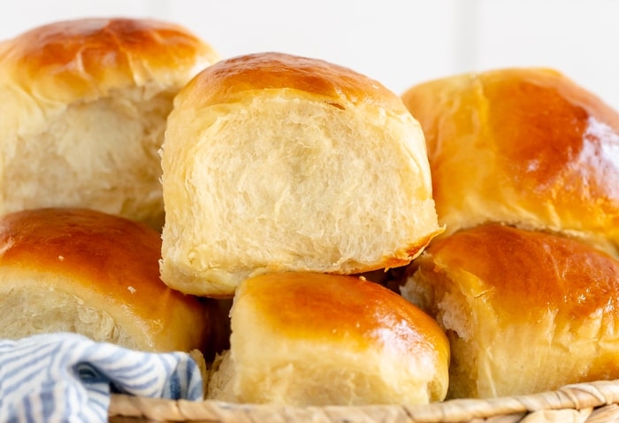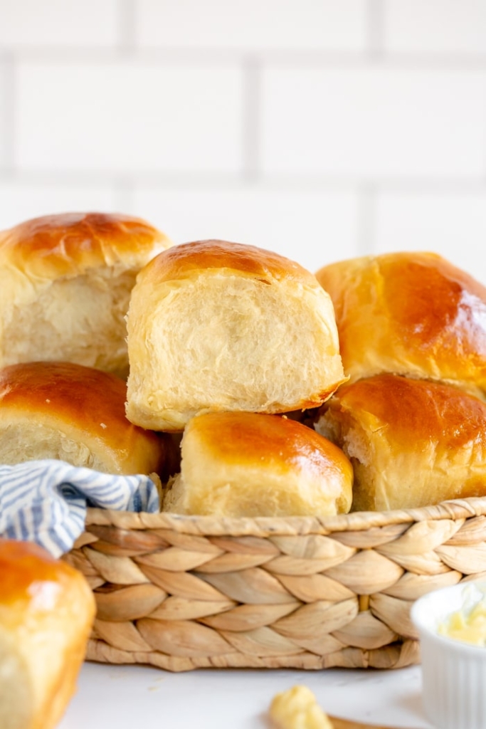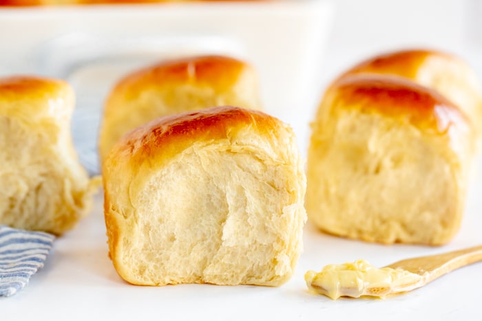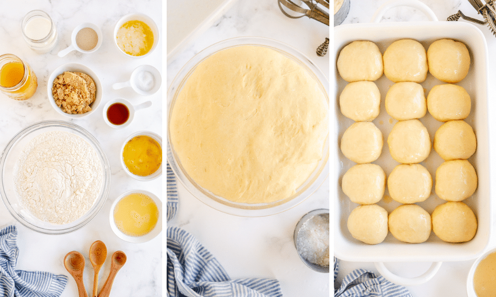 Add your warm milk to a mixing bowl. Sprinkle yeast and sugar on top. Mix. Allow to sit for about 5-10 minutes or until bubbly. To the bowl, add butter, pineapple juice, brown sugar, salt, vanilla, and eggs. Using a wooden spoon, mix until lightly combined. Add two cups of flour and mix with a wooden spoon until flour is mixed in but still lumpy. With your stand mixer with dough hook attached, begin mixing dough with remaining flour until soft but still slightly sticky dough has formed. I used about 4½ cups of flour. Dough will be tacky but shouldn’t stick terribly to your fingers. If needed, move to counter and knead a few times with floured hands. Place in a bowl and cover with plastic wrap and allow to rise for 2 hours or until doubled in size. Punch dough down and form into 15 equal sized dough balls. Try to make them as smooth as possible. Place in a 9×13 inch pan. Brush with egg wash. Cover with plastic wrap and allow to rise for an additional hour or until almost doubled in size. Bake at 350 degrees for 25 minutes or until golden brown and hollow sounding when tapped.