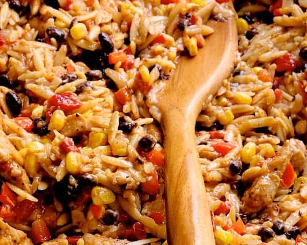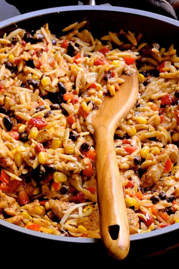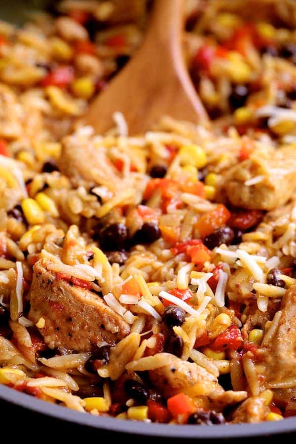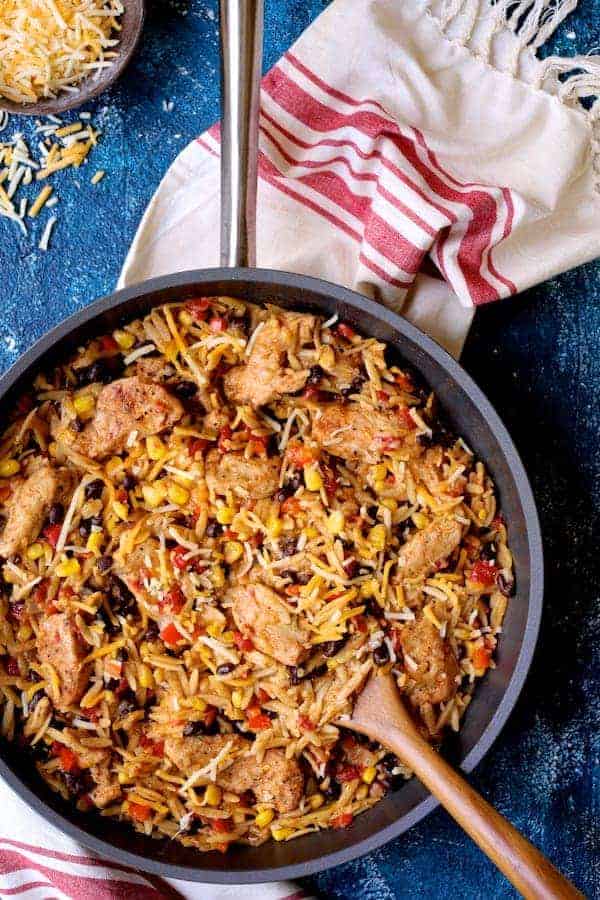 Southwestern Chicken, Orzo and Black Bean Skillet is an easy and festive stove top dinner that’s perfect for a weeknight! Your family will ask for it again and again!