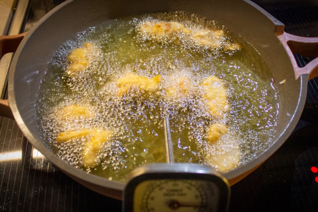 – If you don’t have a frying thermometer, to test the temperature, dip the handle of a wooden spoon or a chopstick into the oil. The oil will bubble steadily (not super vigorously) around the stick when it’s ready for frying.