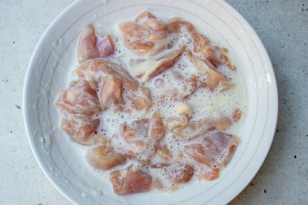 MARINATE CHICKEN: Whisk egg whites, cornstarch, and pinch of salt (and other seasonings Note 1) in a bowl until well blended and fluffy. Mix in chicken and let sit for 10 -15 minutes while you heat oil.
