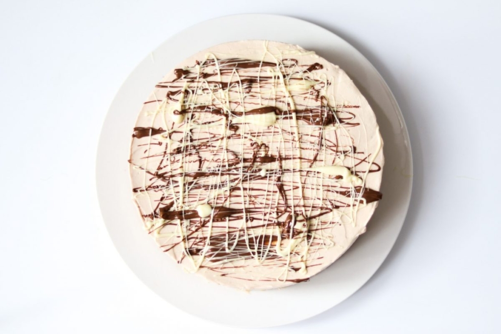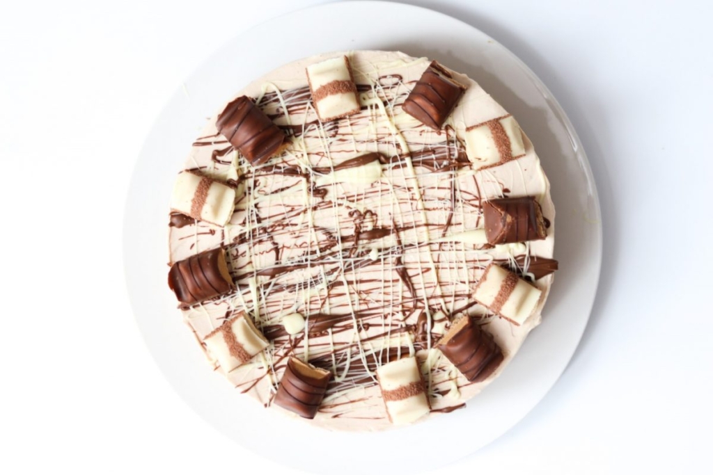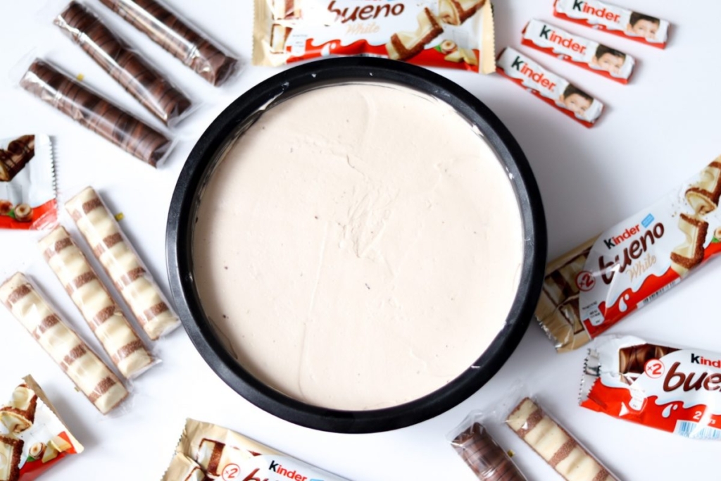 Once the cheesecake has set, melt white and milk chocolate in two separate microwavable bowls. With a teaspoon drizzle the brown chocolate then white chocolate all over the cheesecake to create a marble effect. Top with with Kinder Bueno bars around the cheesecake alternating between white then milk Kinder Bueno bars.