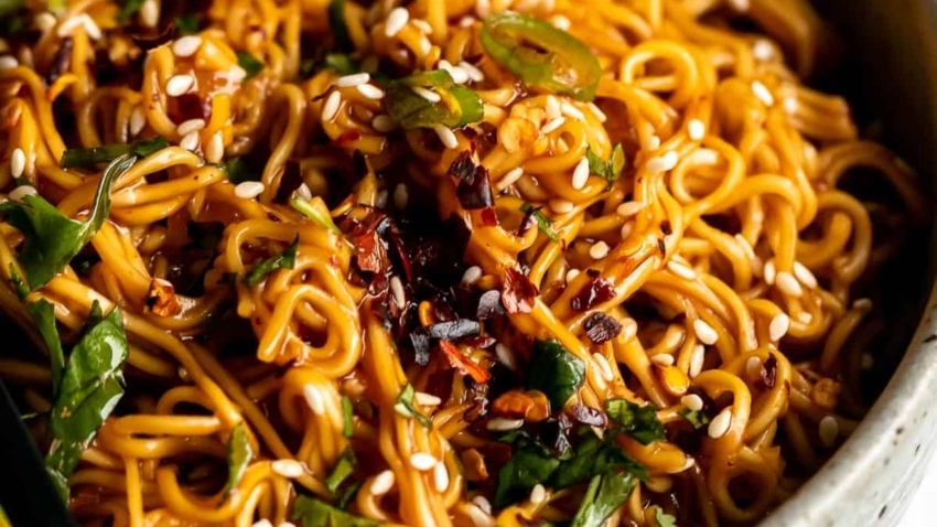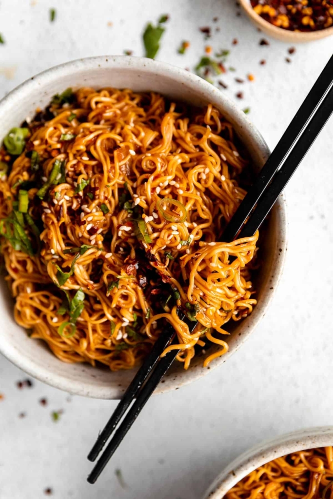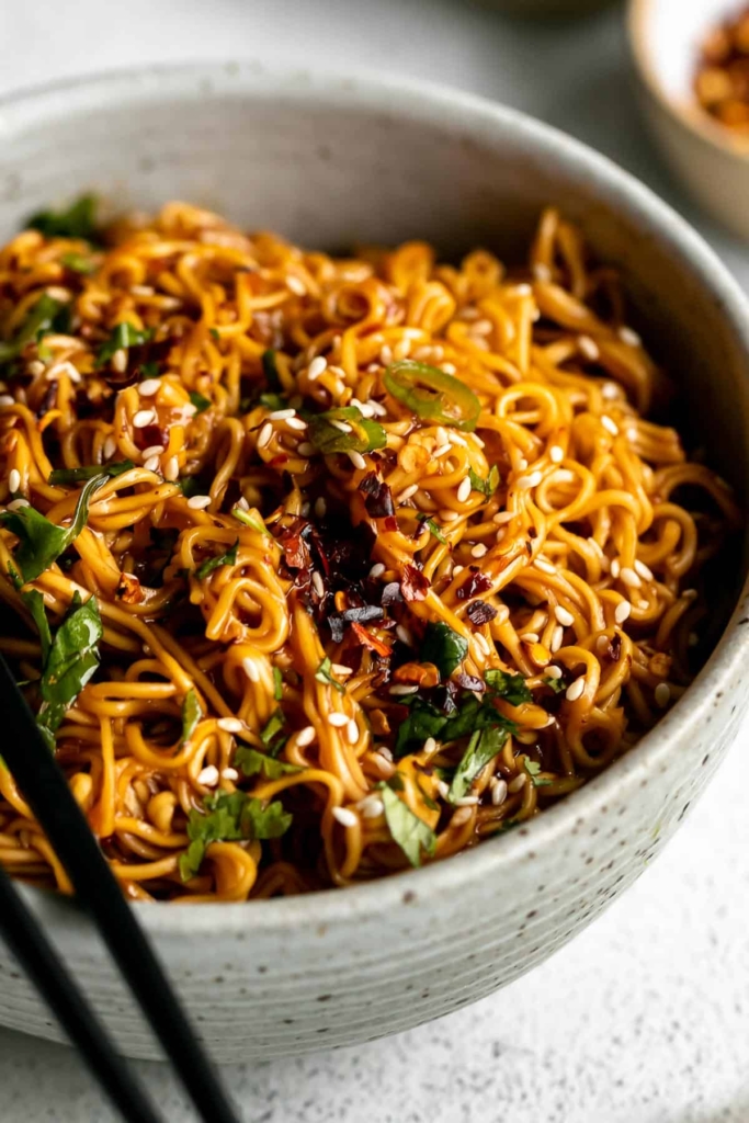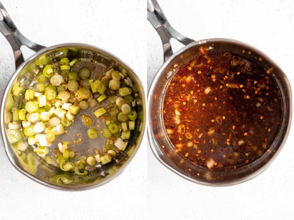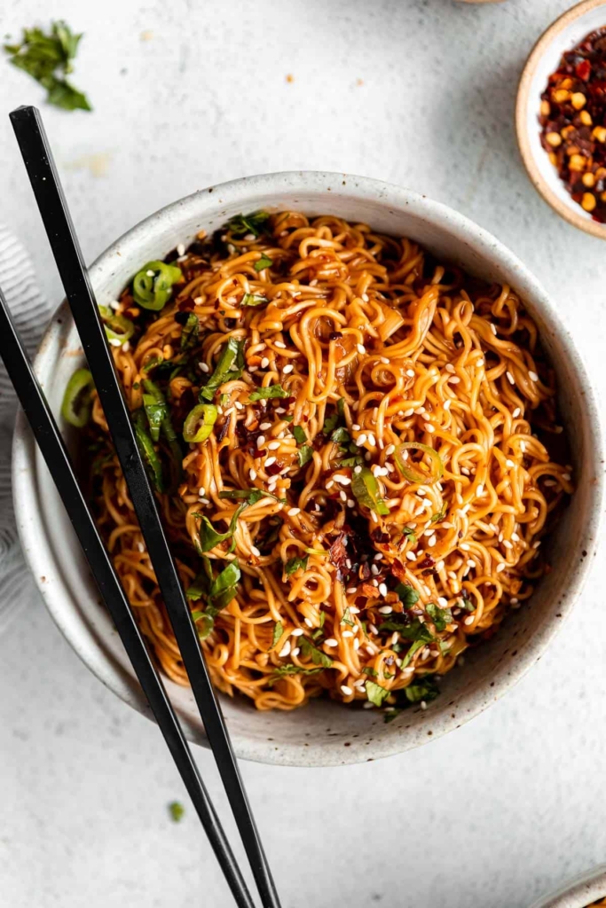 Bring a pot of water to a boil and cook noodles according to package instructions. Add the chopped green onion, ginger, garlic and oil to a small sauce pan and saute for about 3-5 minutes. Add in all remaining sauce ingredients and whisk well. Simmer over low heat for about 5 minutes. Combine the cooked noodles with the sauce and let simmer for a few minutes to let the flavors blend. Taste and adjust flavors as desired. Serve with fresh green onion, cilantro and more red pepper flakes to taste!