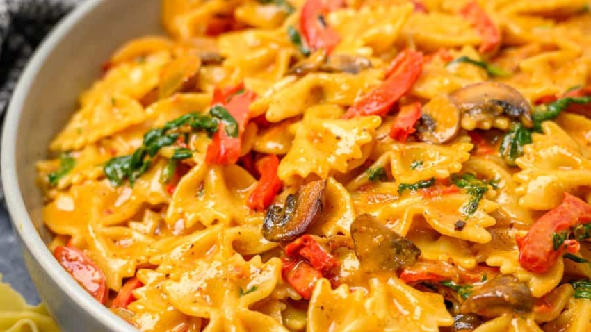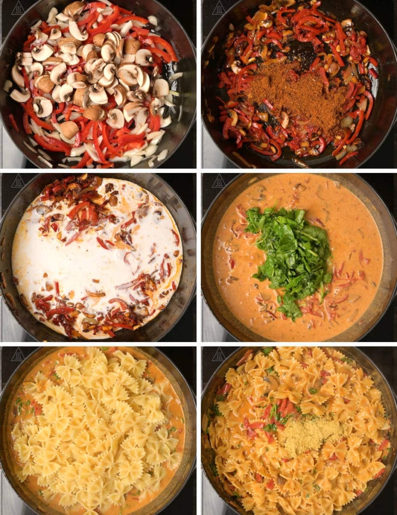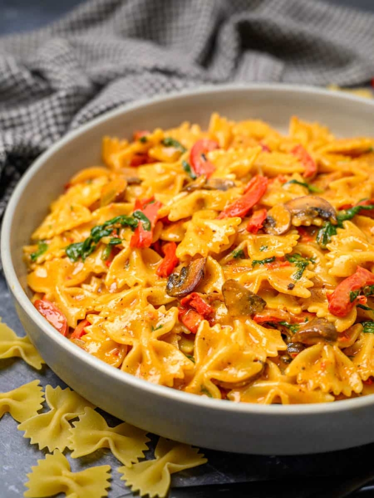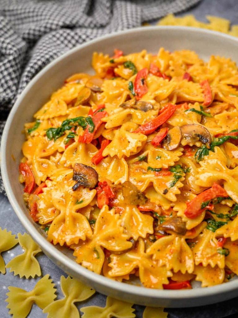 Bring a large pot of water to a boil and cook the pasta 1 minute less than specified in the instructions on the package. Reserve a cup of pasta water before draining. Meanwhile, heat the olive oil in a large pan and saute the onion and red pepper for 5-6 minutes over medium heat until they soften. Add the mushrooms and continue to cook for another 5 minutes until there’s no more liquid left and the mushrooms are slightly browned. Stir in the garlic and cook for another minute until fragrant. Add the tomato paste and fajita seasoning mix and stir to combine. Add the coconut milk, stir to combine and bring to a boil. Lower the heat and simmer for 2-3 minutes until the sauce thickens. Stir in the baby spinach and keep cooking for 1-2 minutes until the spinach wilts. Transfer the cooked pasta to the pan and toss it well with the sauce. Stir in the nutritional yeast if using, season to taste and serve immediately.
