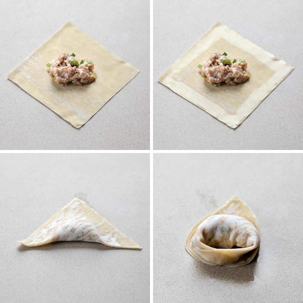 In a bowl, combine pork, rice wine, soy sauce, sesame oil, ginger, sugar, and onion. Mix well. Place 1 teaspoon of filling into the center of each wonton wrapper. Moisten edges with water and fold the corners together, pressing out any excess air. (It should look like a triangle). Slightly lift the long edge of the wonton. Wrap the edges in the opposite directions and press firmly to seal, using your finger to create a space and wetting the edges as needed. Continue with the rest of the wontons and let them rest while you prepare the soup.