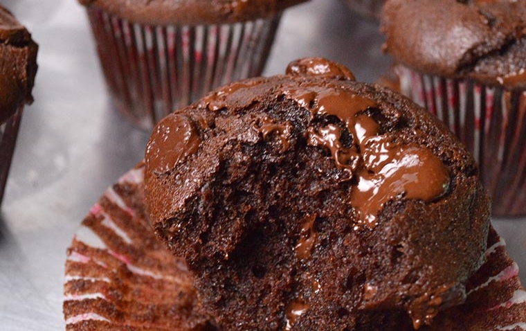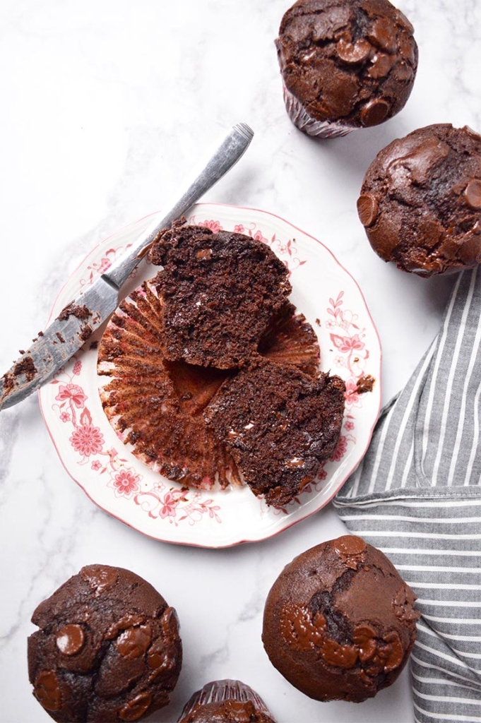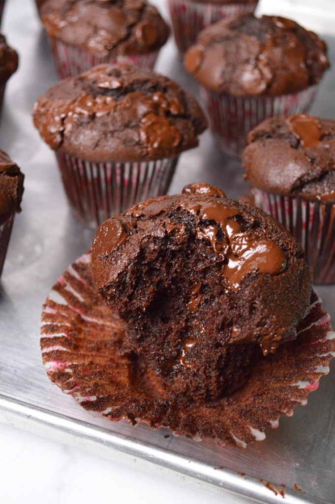 Preheat oven to 425F/220°C. Line the tin with cupcake liners. In a medium bowl, mix all-purpose flour, cocoa powder, baking powder, baking soda, and salt until well combined. Set aside. In a large bowl, whisk together vegetable oil, granulated sugar, eggs, milk, vanilla extract, and sour cream until well combined. Sift in the dry ingredients into the wet ingredients and stir until well incorporated. Fold in 1 1/2 cups (255 gr) of chocolate chips into the batter. Spoon the batter evenly into each cup or liner, filling each all the way to the top. Distribute the remaining chocolate chips evenly over the muffin tops, pressing them gently into the batter. Bake the muffins for 5 minutes at 425F/220°C. Then, keeping the muffins in the oven, reduce the oven temperature to 350F/180°C. Bake for an additional 15-17 minutes or until a toothpick inserted in the center comes out clean. Allow the muffins to cool for 5 minutes in the muffin pans, then transfer to a wire rack to continue cooling.