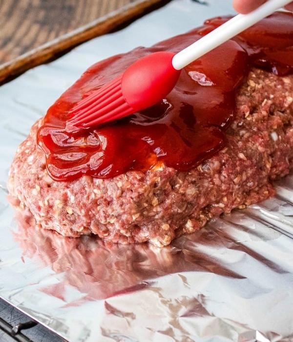 Preheat oven to 185ºC/350ºF. In a small bowl mix together glaze ingredients and set aside. In a large bowl mix all of the meatloaf ingredients until well combined. Place mixed meatloaf on a prepared baking sheet and shape into a 9X5 inch loaf. Spread half of the glaze all over the top and sides of meatloaf. Bake for 30 minutes. Spreading remaining glaze over the top and sides of meatloaf. Bake for 35 – 45 minutes longer, or until thermometer registers 95ºC/160ºF. Let meatloaf rest 15 minutes before slicing and serving.