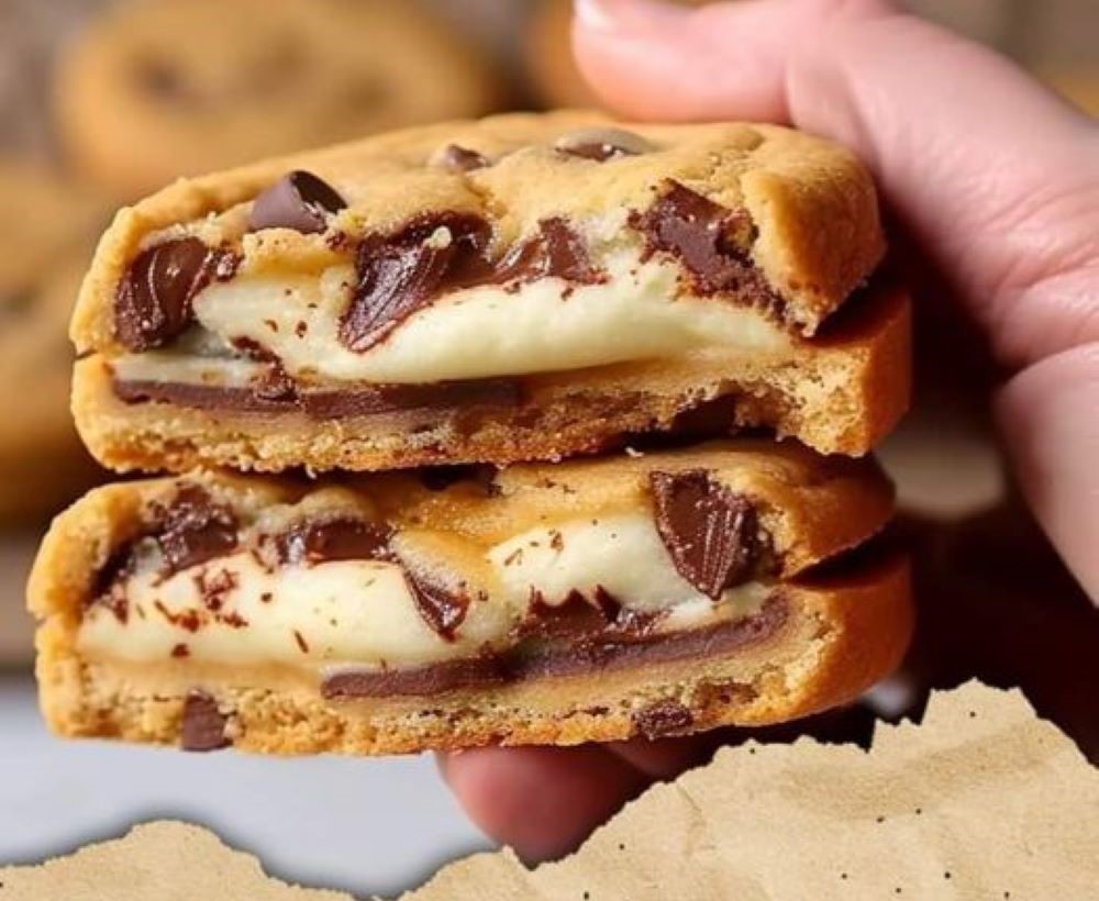 Enjoy these delightful cheesecake-stuffed chocolate chip cookies as a decadent treat!