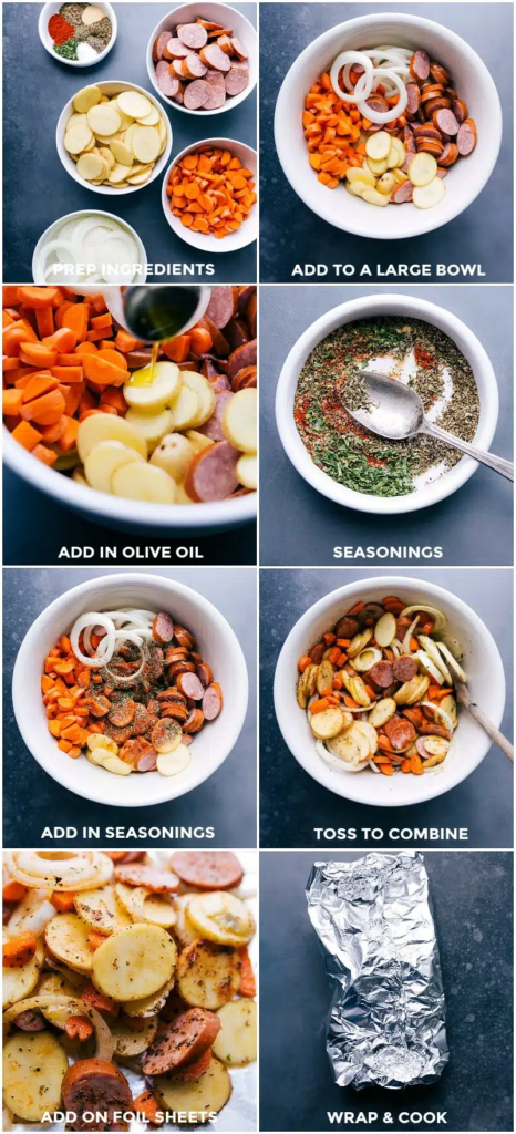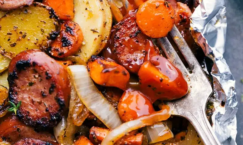A twist on classic Hobo Foil Packets using sausage instead of ground beef. We’ve got the classic carrots, onions, and thinly sliced potatoes. A truly comforting, filling, and hearty meal that’s great for a no-mess meal or campfire dinner!