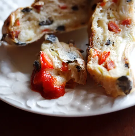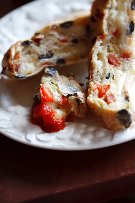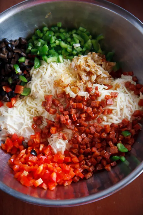 1 1/2 cups favorite toppings, chopped, Use your favorite pizza toppings for this. I used red bell peppers, green peppers and pepperoni to keep it kid-friendly. Other suggested add-ins: caramelized onions and roasted garlic (dry roast unpeeled cloves on a skillet for about 5 minutes, then finely mince or mash into a paste). If using a topping that will render fat, such as bacon, pepperoni, salami, etc; microwave it for a minute or two to prevent the fat from rendering into the dough while baking, which will alter the texture of the bread.