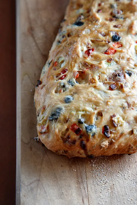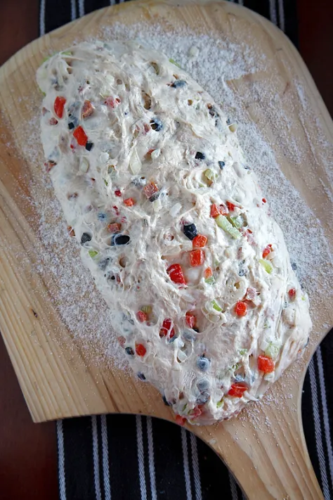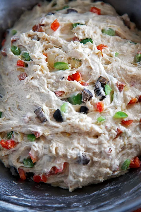 Sprinkle yeast over warm water in a bowl. Let it sit for 3 minutes until foamy, then add in flour and salt. Mix (using a mixer, spoon, or your hands) just until it comes together. Add in the olives, and the other toppings, and combine well. Dough will be tacky, but feel free to dust with a bit more extra flour if it feels too tacky. Let rise for about 1 hour, then put in the refrigerator for another hour.