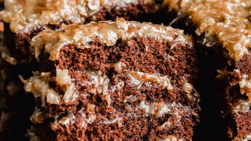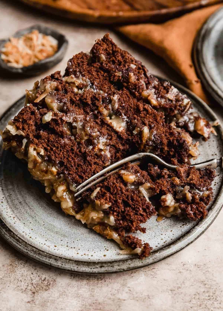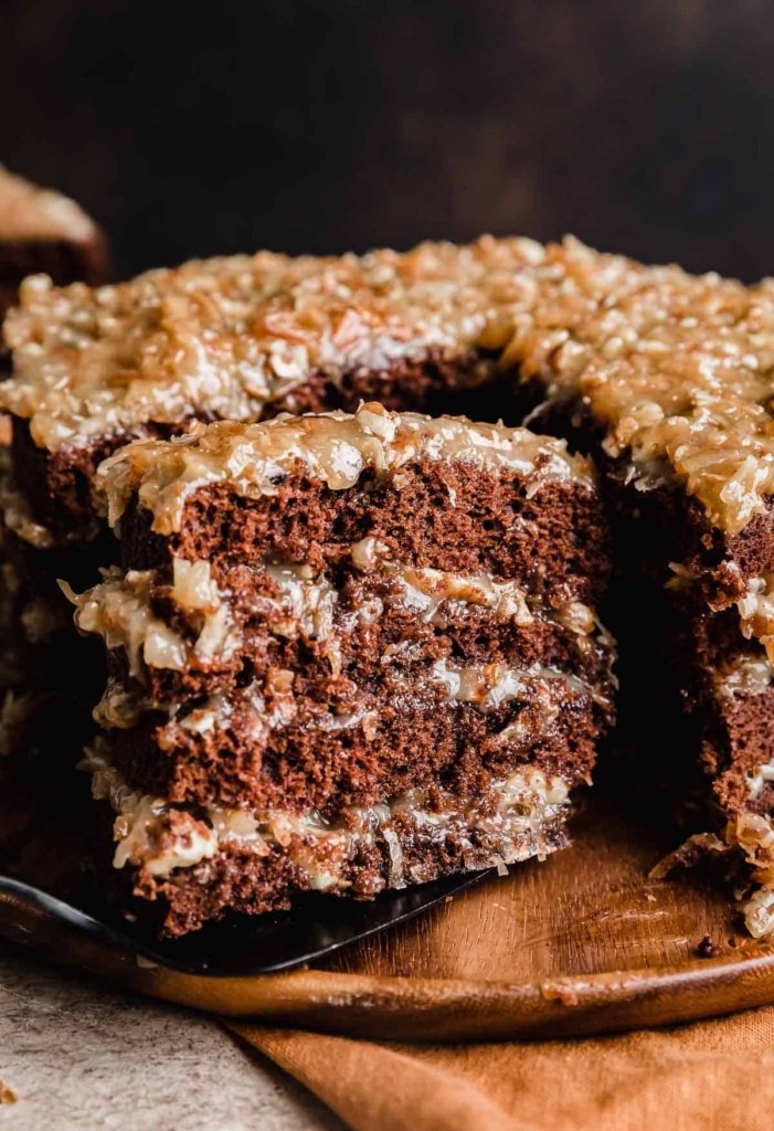 A delicious and moist German Chocolate Cake topped with a homemade coconut pecan frosting.