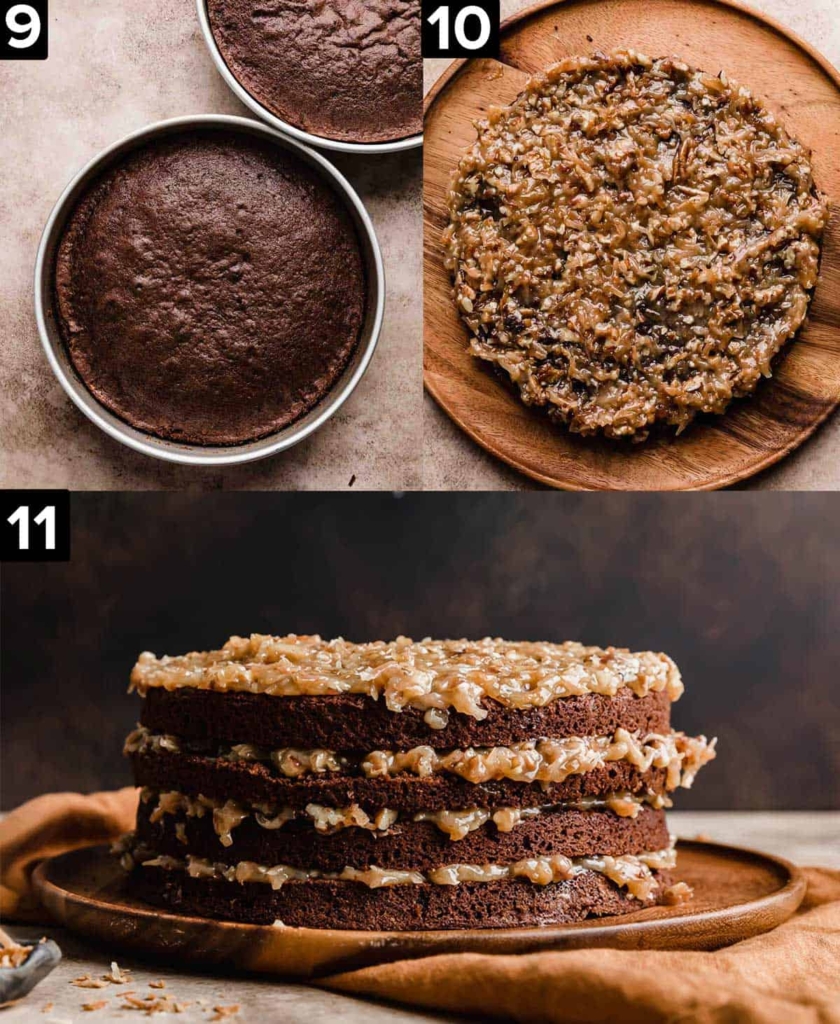 Remove from the heat and add the butter, vanilla, toasted coconut and pecans. Mix to combine. Set aside to cool to room temperature. The frosting will thicken even more as it cools.