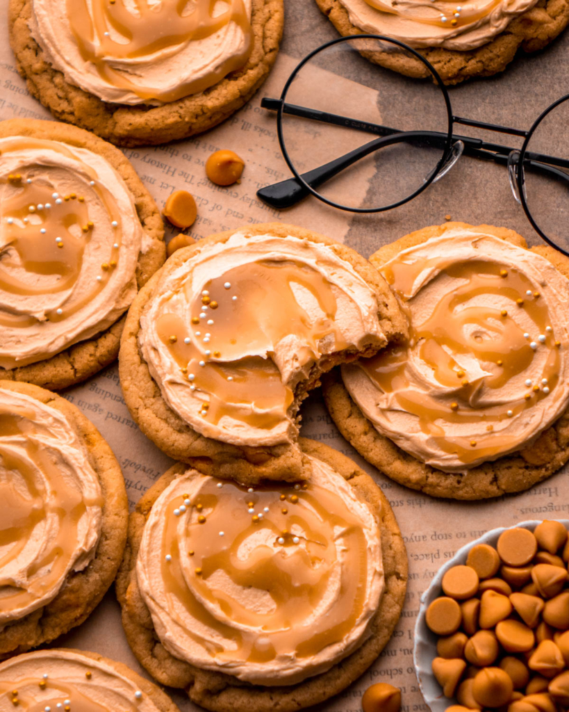 These Harry Potter butterbeer cookies will transport you right into the wizarding world! They’re extra chewy cookies flavored with butterscotch, vanilla and butter flavor, frosted with butterscotch buttercream and drizzled with butterbeer caramel sauce.