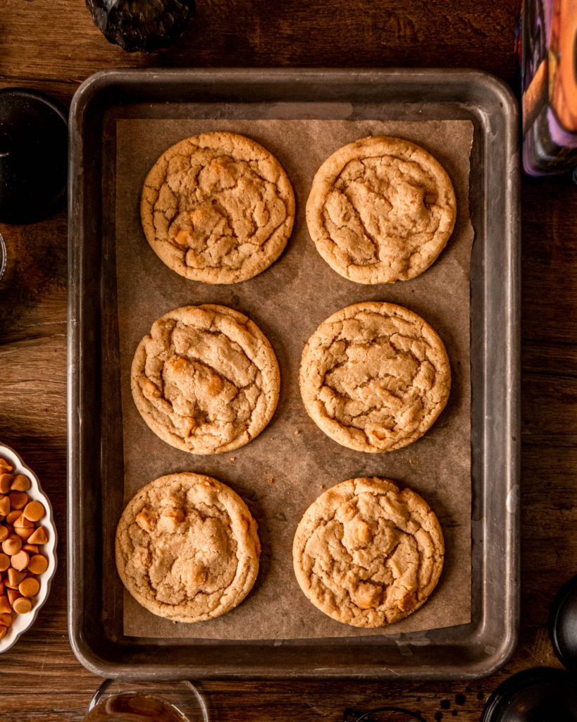 In a medium bowl, whisk the flour, baking powder, baking soda and salt together. Then set aside the flour mixture. In a large bowl, cream the butter, brown sugar and granulated white sugar together with an electric mixer on high speed until light and fluffy, 2-3 minutes. (You can use a stand mixer fit with a paddle attachment.) Add in the egg yolks, vanilla extract, butter extract and melted butterscotch chips and mix on medium speed until pale in color and fluffy, 1-2 minutes. Scrape the sides of the bowl as necessary. Add the dry ingredients to the wet ingredients and mix on low speed just until combined. Mix the butterscotch chips into the dough with a rubber spatula. Scoop the dough with a large cookie scoop, or eyeball it, into 2 tablespoon portions. Arrange the cookie dough balls 6 at a time, 2 inches apart, on a parchment paper lined baking sheet. Bake the cookies for 10-11 minutes. Right after baking, scoot a large circular cookie cutter, or a large glass, around the cookies to give them a perfect circular shape. Let the cookies cool on the cookie sheet for five minutes then transfer them to a wire rack to completely cool.