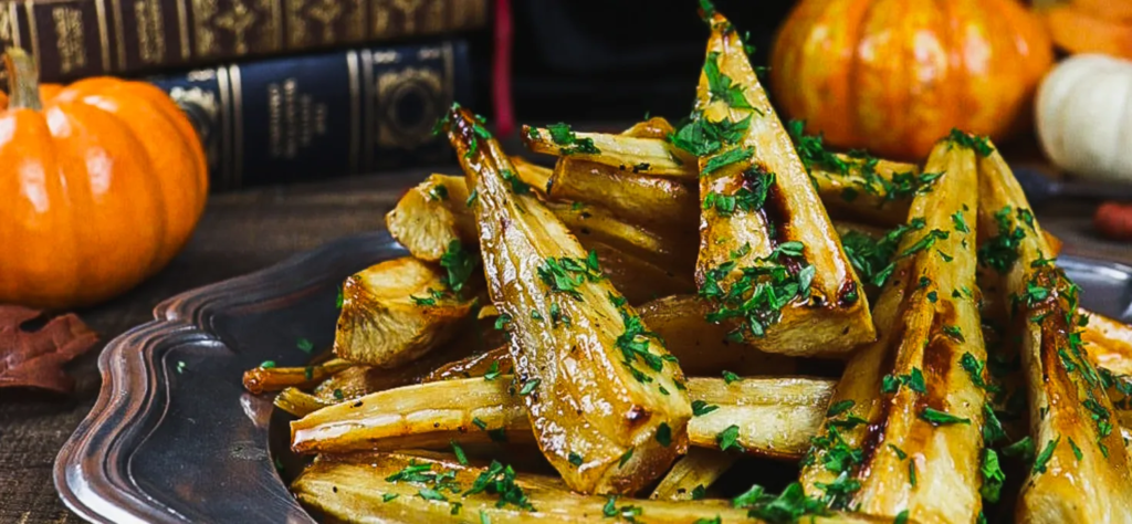 Roasted parsnips with a sticky, candied glaze bursting with fresh apple flavor is the perfect fall side for a classic English roast dinner! While parsnips might not be the most popular vegetable around, particularly here in North America, they are a favored side at many an English roast dinner. This recipe is the perfect way to give this unassuming vegetable a try. Roasting brings out the natural sweetness in these earthy root vegetables and a sweet and sticky cider reduction glaze transforms the humble parsnip into a delicious and elegant side for our Hogwarts feast!