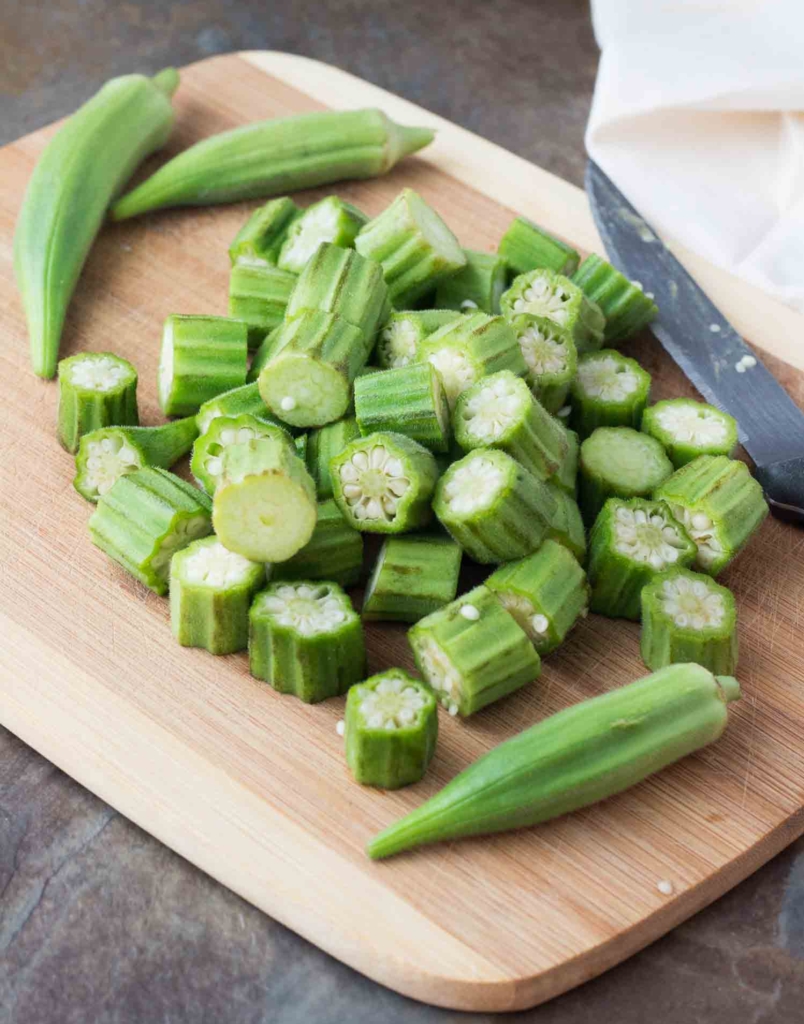 Remove the stem ends of the okra. Slice each okra pod into 3/4 to 1 inch thick pieces.
