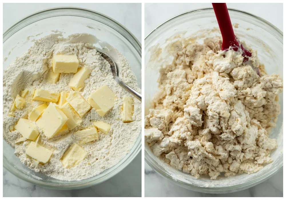 Cut the cold butter into cubes and add it to the bowl. Use a pastry cutter (or the back of a fork) to work it in until coarse crumbs form). Create a hole in the middle of the dry mixture and add the cold buttermilk and honey. Use a silicone spatula to gently stir until just combined. Don’t overmix. It will be crumbly.