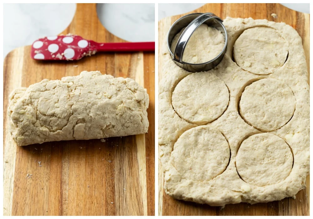 Roll the dough back out until it’s 1 inch thick again and cut 2 more biscuits. You should end up with about 8 biscuits total.