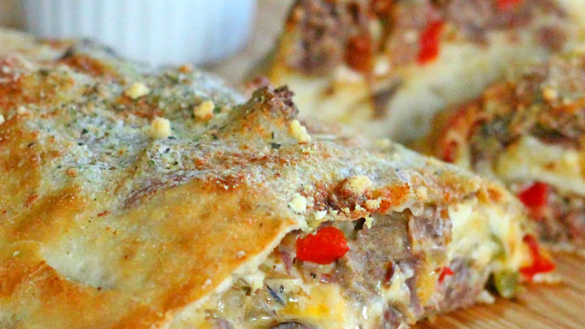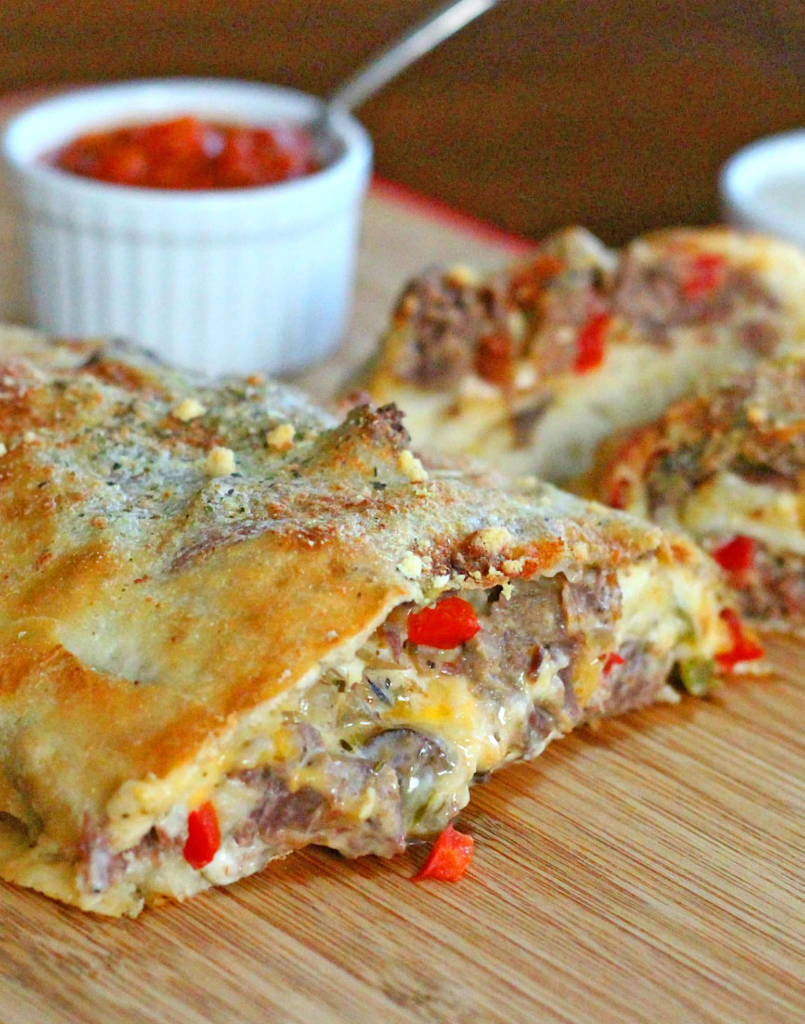 Pepper Steak Stromboli is not only delicious it’s budget friendly, too. It allows you to wrap-up leftovers in pizza dough stretching them into a spectacular round two meal that the whole family will love.