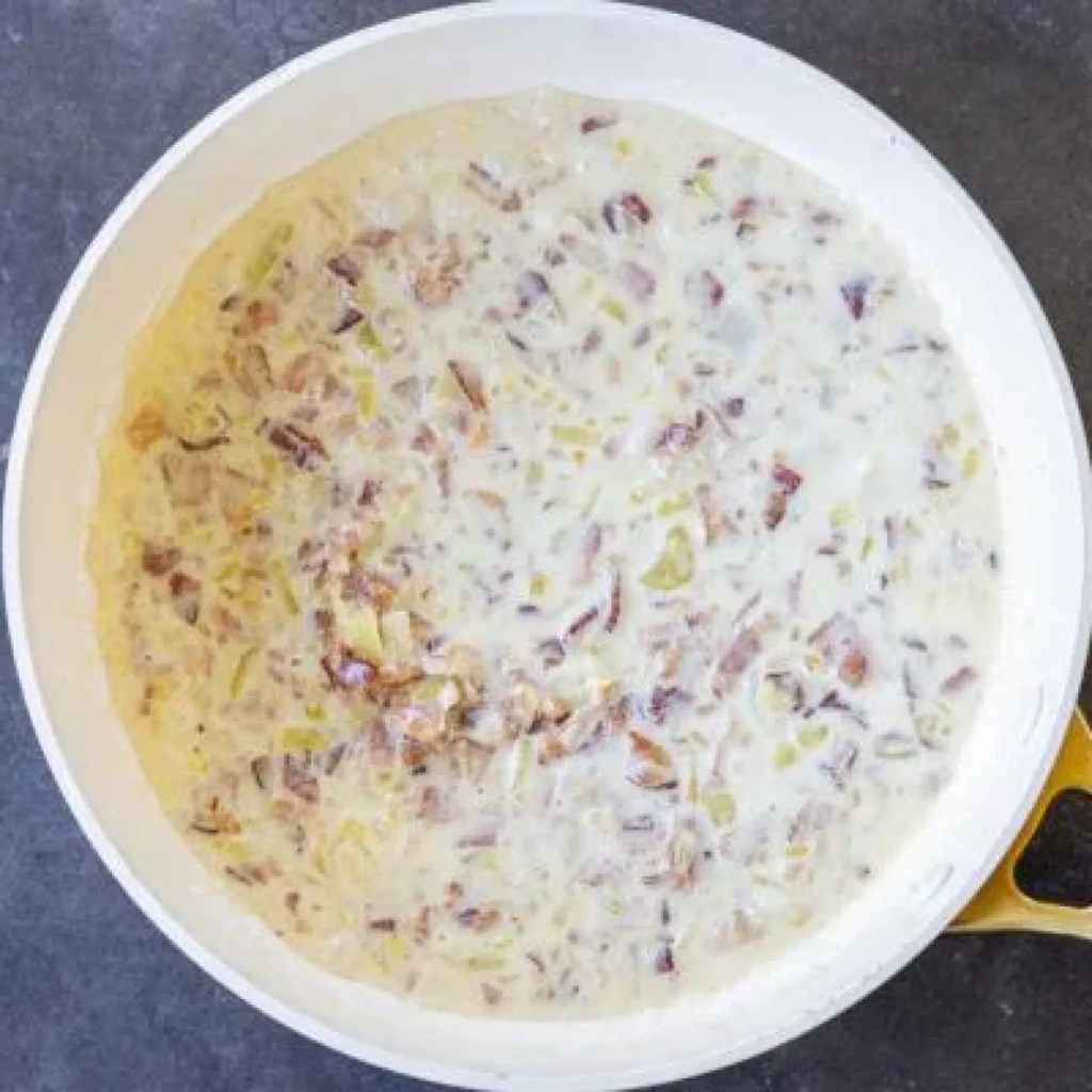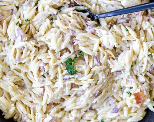This creamy orzo recipe is made with a white sauce of crispy bacon, caramelized onions, and salty parmesan cheese. Perfect as a side dish or light meal!