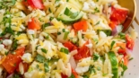 Cook the orzo in salted boiling water until al dente, then drain and rinse with cold water until completely cool. Give it a good shake to discard the excess water, then add into the bowl. Stir in the pepper and cucumber.