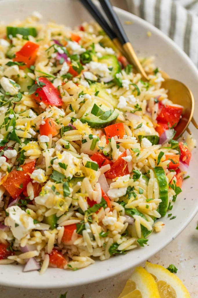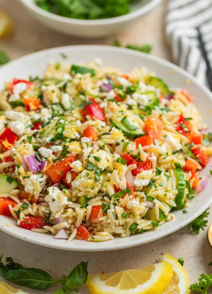 Simple to prep and so flavorful, this Lemon Orzo Salad is so quick to toss together and a perfect side dish for any meal. Loaded with fresh herbs, cucumbers, peppers and lots of feta. Lemon zest and juice give the salad a vibrant and fresh flavor everyone will love!