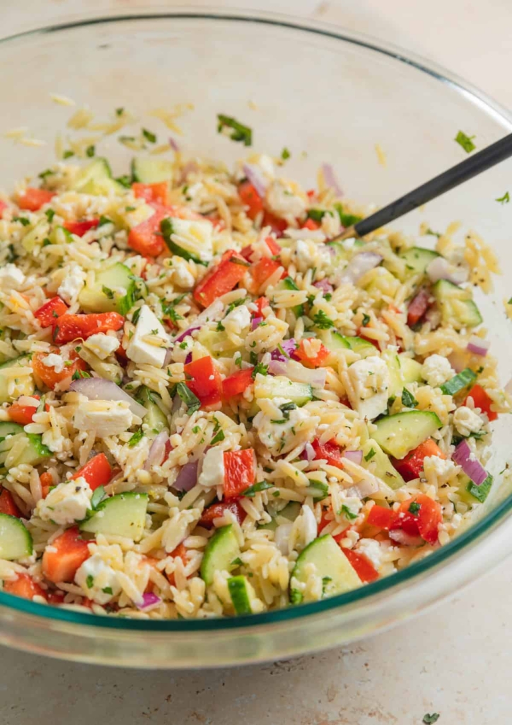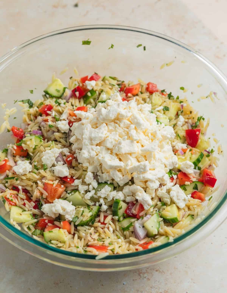 Cook orzo according to package instructions. Chop and prep all veggies. When orzo is cooked al dente, drain the water and then pour cold water over the orzo to cool it off. Drain the water completely. Add the orzo and all other ingredients except the feta into a large bowl (you can wait to add the honey until after tossing.) Toss the salad well. Add more olive oil if desired and adjust salt and pepper to taste. Fold the feta cheese into the mixed salad. Chill until ready to serve. Toss just before serving and add an extra drizzle of olive oil if desired. Refrigerate leftovers in a sealed container for about 5 days.