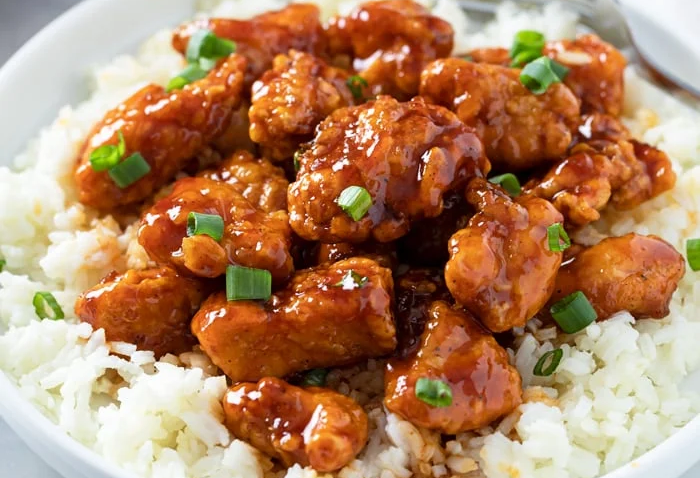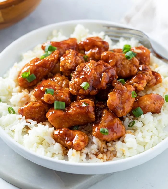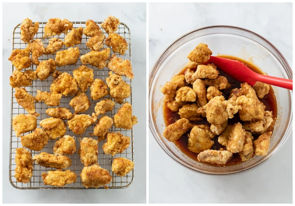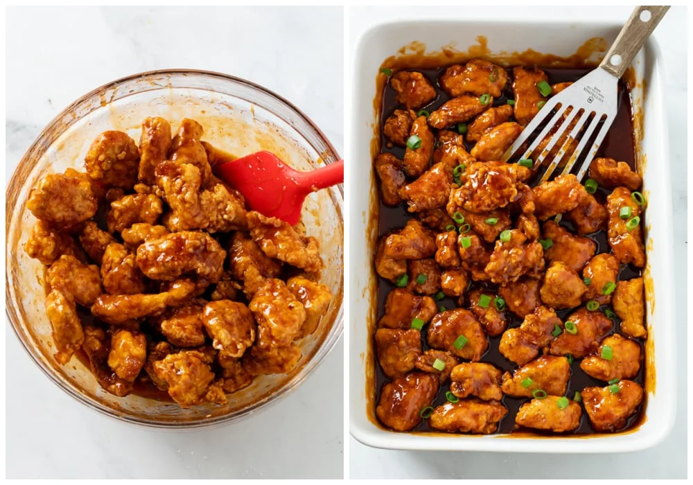 Once all of the chicken has been fried, add the chicken to the large bowl with the sauce and gently toss to coat. Transfer to a 9 x 13-inch baking dish.
