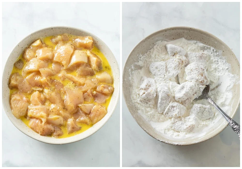 Heat 1 cup vegetable oil over medium-high heat to 365 degrees. Just before frying, coat the first batch of chicken with cornstarch, then briefly dip each back into the whisked eggs.