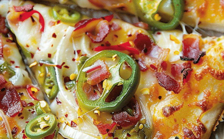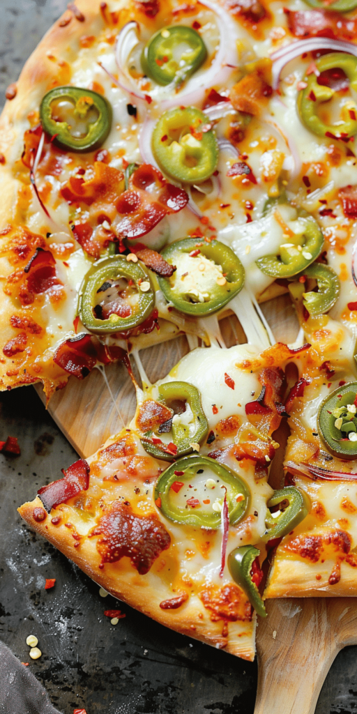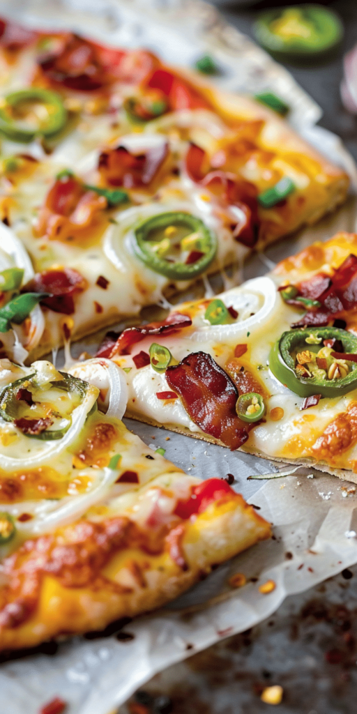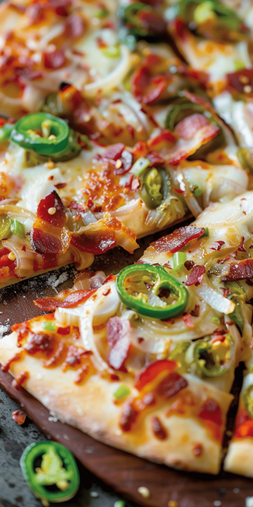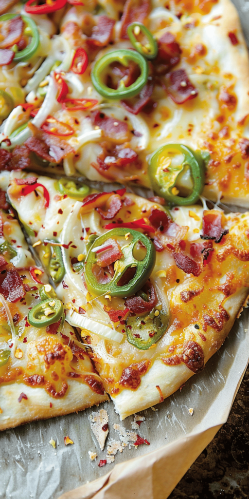 Jalapeño Popper Pizza combines the fiery taste of jalapeño poppers with the beloved form of a pizza, creating an unforgettable culinary experience. This innovative pizza incorporates the spicy kick of jalapeño peppers, the creamy texture of cheese, the savory flavor of bacon, and the fresh crunch of white onions and bell peppers. It’s a recipe designed for those who love a bit of heat and a lot of flavors in their meals.
