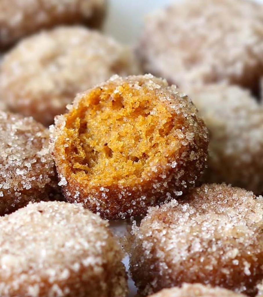 Pumpkin spice is back at Starbucks and the Halloween section is in full swing at almost every market, which means it’s officially “OK” and socially acceptable to get really, really excited for pumpkin season ! So if you wait to bake with pumpkin until it’s time for Thanksgiving pie, you’ll be missing out on some excellent desserts. I like to allow my pumpkin obsession to continue until Thanksgiving, and then straight to Christmas cookies and hot chocolate from there. Here is a fun & easy recipe for baked, not fried (so you can eat more !) pumpkin donut holes to get you excited for Fall breakfast. They literally are SO EASY to make that I thought I must be doing it wrong. From start to finish this was maybe a half-hour project, and I was so happy with how they came out. So grab a mini muffin pan and come bake with us!