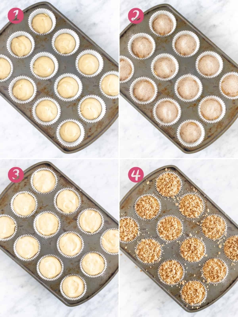 Spoon about 1 tablespoon of muffin batter on top of each muffin. After covering the cinnamon sugar layer of all 12 muffins, add a little extra muffin batter on top of each if you have batter left. The muffins papers should be about ⅔ to ¾ full.