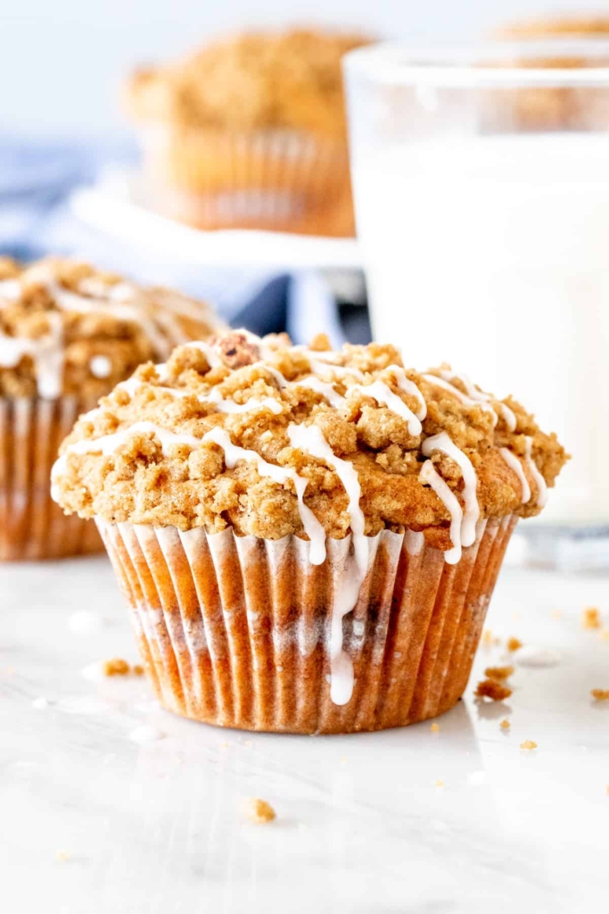 Nutrition Information: Details provided are an estimate only and based on 1 muffin, assuming the recipe yields 12 equal-sized muffins and all of the streusel and glaze is used.
