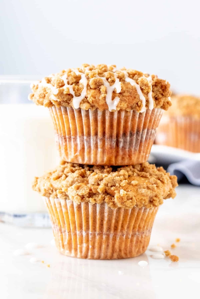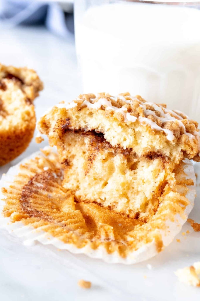 Coffee cake muffins are moist and fluffy with a delicious buttery vanilla flavor. They have a layer of cinnamon sugar in the middle and crunchy cinnamon streusel on top that adds a delicious crunch.