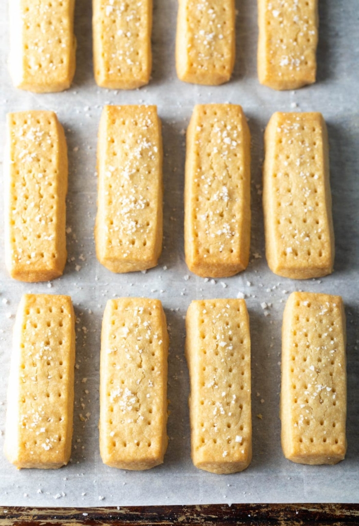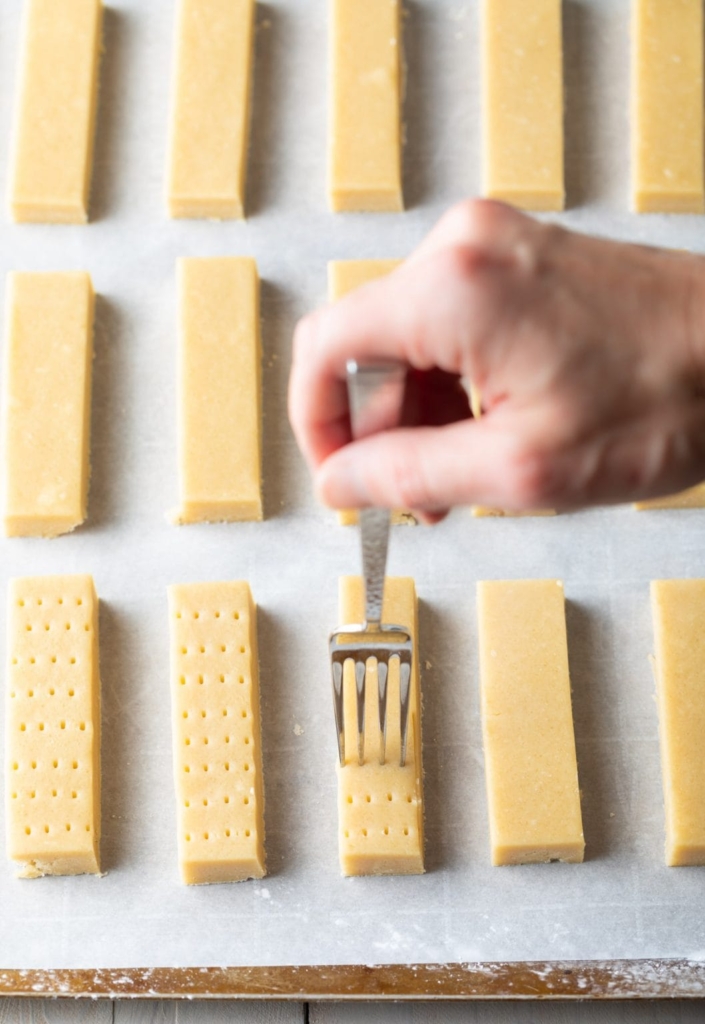 Use a large chef’s knife (or pizza cutter) to cut the shortbread dough into 2 ½ X 1 inch pieces. Carefully move the pieces to the baking sheets, spreading them 1 ½ inches apart.
