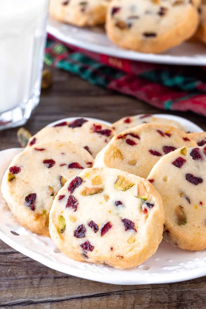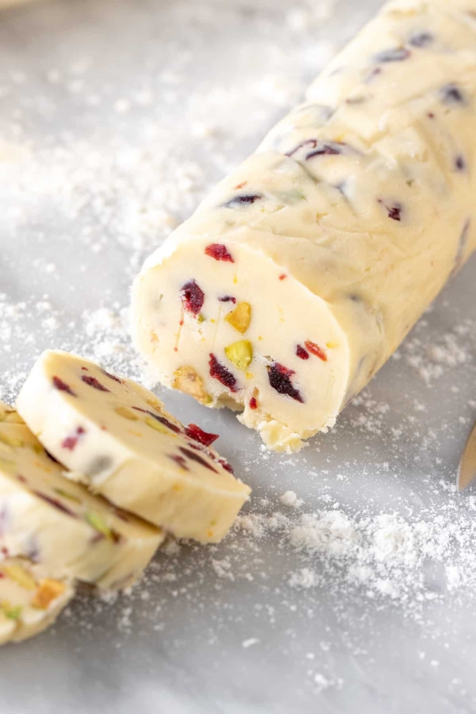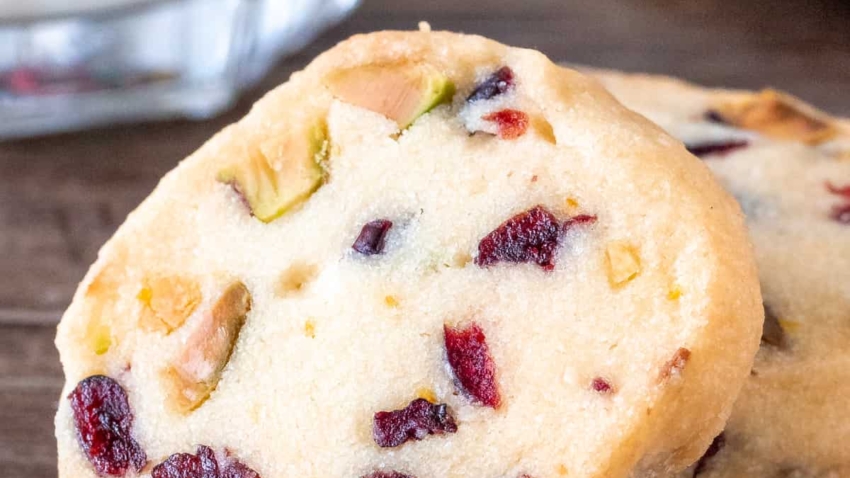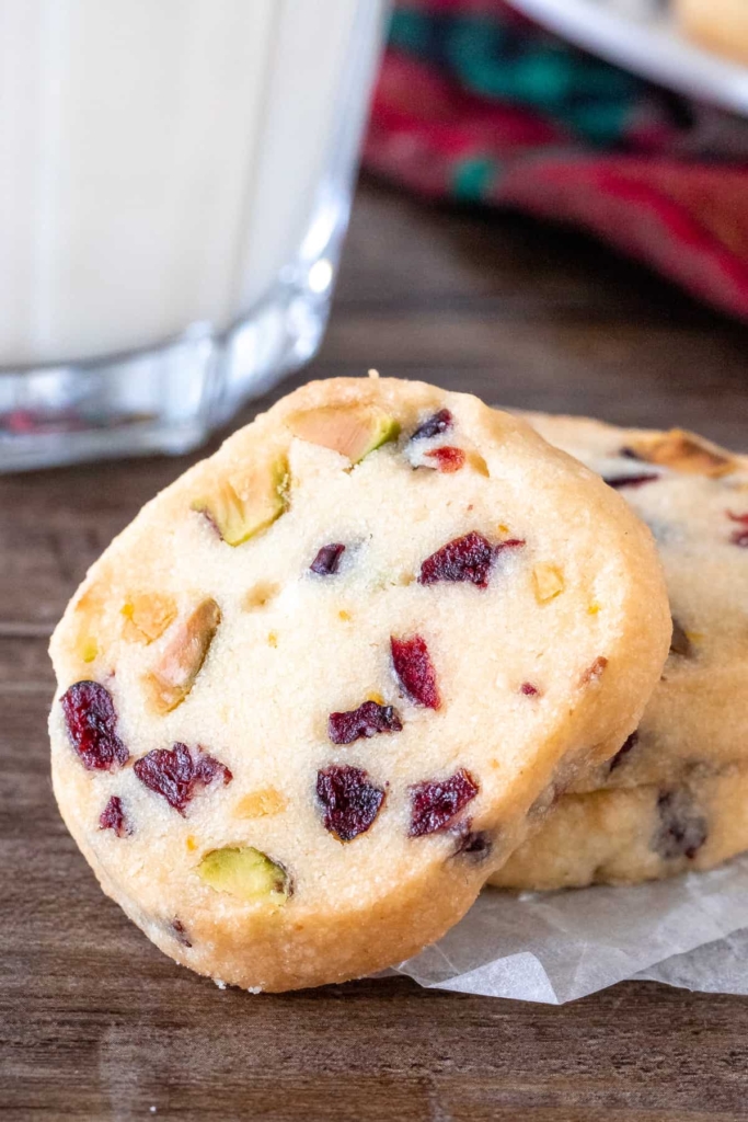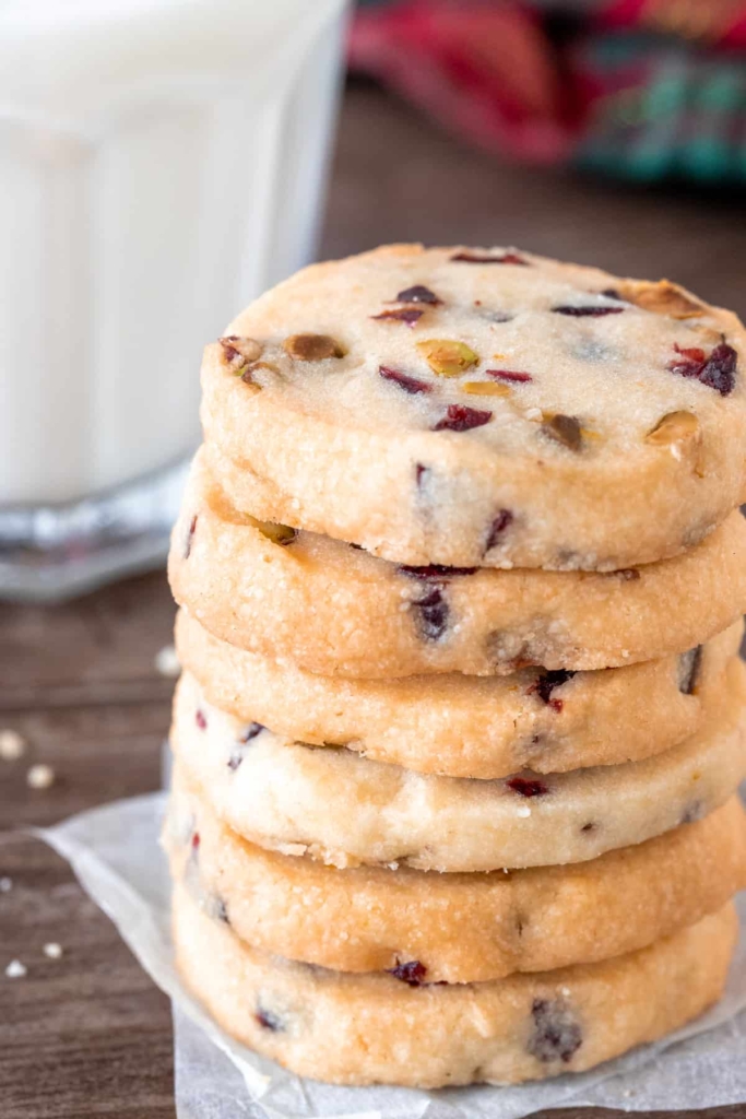 This buttery shortbread is filled with cranberries, pistachios and orange zest. It’s an easy slice and bake cookie is perfect for the holidays.