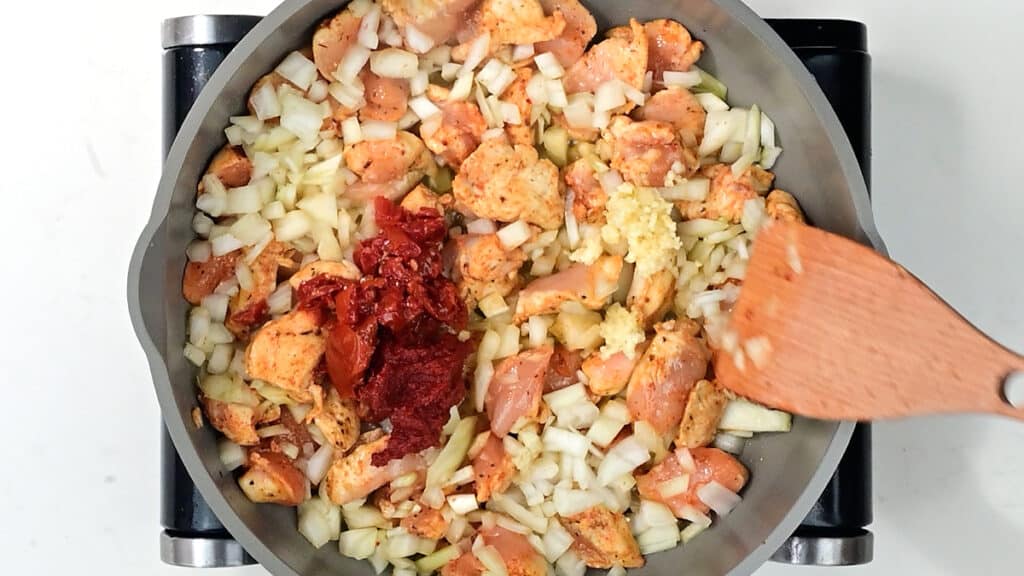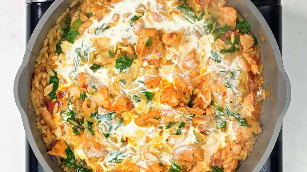 Combine the chicken, Cajun seasoning and salt. Heat the butter and oil in a large pan (a Chef’s pan with a lid is ideal) and pan fry the chicken until it starts to color. Add the onion, garlic, sun-dried tomatoes, tomato paste and stir to combine. Cook over low heat for five minutes, stirring frequently. Stir in the orzo, cook for a minute or so then add the chicken broth. Bring to a simmer, cover the pan and cook for about 20 minutes, stirring frequently. Orzo absorbs liquid readily so keep an eye on the pan and add a little extra water, as needed, if the pan gets too dry. Uncover the pan and test the orzo – it should be almost tender but with a little bite to it. Stir in the shredded spinach so that it wilts. Stir in the cream and add the grated Parmesan. You should have a deliciously indulgent sauce, creating a perfectly creamy dish. Check the seasoning and serve with extra Parmesan cheese.