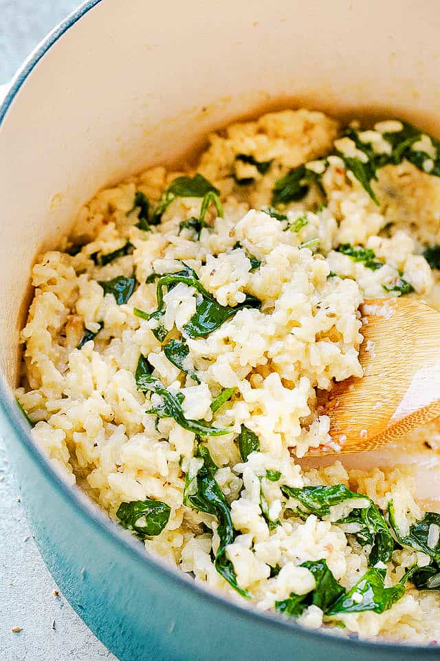Set a Dutch oven or a medium-sized saucepan over medium heat and melt the butter. Stir in the garlic and cook for 3 to 4 minutes, stirring frequently. Do not burn the garlic. Add rice and stir around to evenly coat with the melted butter. Stir in the milk, water, salt, and pepper, and bring the mixture to a boil. Cover with a lid and reduce the heat to low; cook for 20 minutes, stirring occasionally. Remove the lid and stir in the Parmesan cheese, baby spinach, and 1 tablespoon parsley. Remove from heat; cover and let stand for 3 minutes. Garnish with remaining parsley and serve.